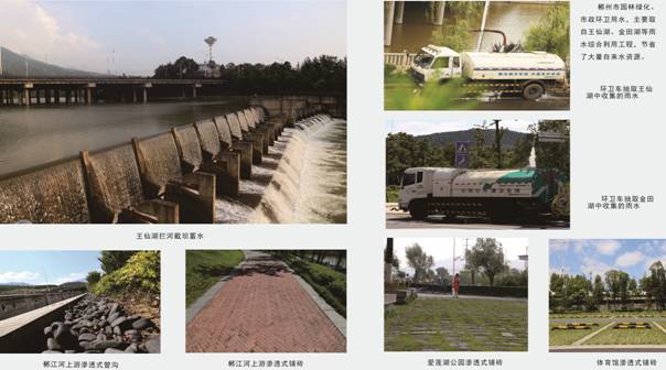 在郴州推进城市节水、建设海绵城市的过程中,郴州市委、市政府提出“合理利用自然水体,充分使用非常规水”的要求。通过在公园景区低洼地段补充建设景观池,实现汛期分担防汛压力,旱期补充绿化用水的雨水综合利用系统;在道路绿化边坡建设蓄水池,创新了道路绿化边坡浇灌用水自给自足的模式;新建河道取水点21处,用于道路清扫、园林绿化等市政公益用水禁止使用自来水的管理模式;制定雨水利用推广计划,近两年新建二十多个采用下凹式绿地、渗透铺装、渗透管沟、渗透井、绿色屋面等措施的雨水利用工程项目,充分利用好非常规水资源。