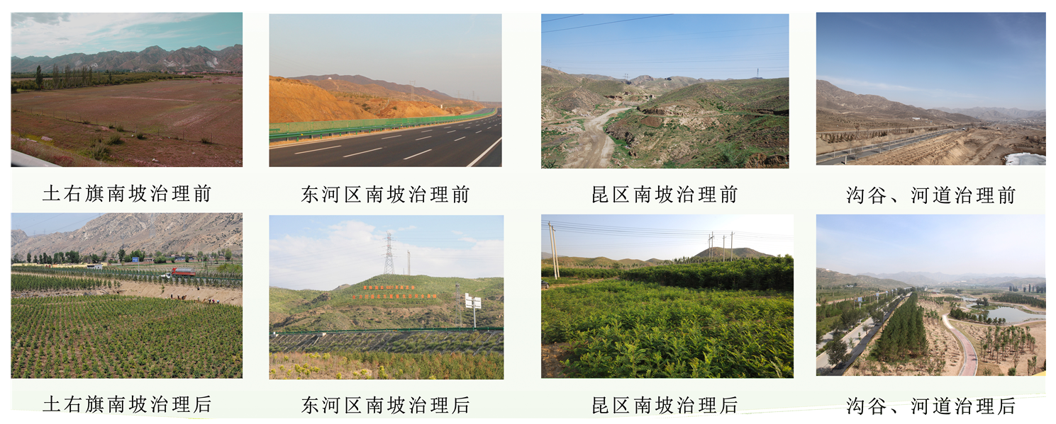在生态修复城市修补理念指导下,包头市通过开展绿化修复工程提升城市形象和品位,改善城市生态、优化城市人居环境、提升城市功能。根据生态修复城市修补工作方案,2017年包头市市委、市政府决定全面启动大青山南坡矿山地质环境治理及生态恢复工作,并印发了《包头市大青山南坡范围矿山地质环境治理及生态恢复项目实施方案》,治理工作涉及昆区、青山区、东河区、九原区、石拐区、土右旗六个旗区共147处矿山,治理总面积25.66km2,各旗县区政府已开展了大量的工作。通过实施大青山南坡绿化生态修复工程,形成了大规模集中连片的造林绿化区,在涵养水源、防风固沙、改善山区生态系统等方面起到了积极作用,为打造包头的后花园、发展生态旅游、休闲娱乐、田园综合体等生态旅游项目奠定了坚实基础。