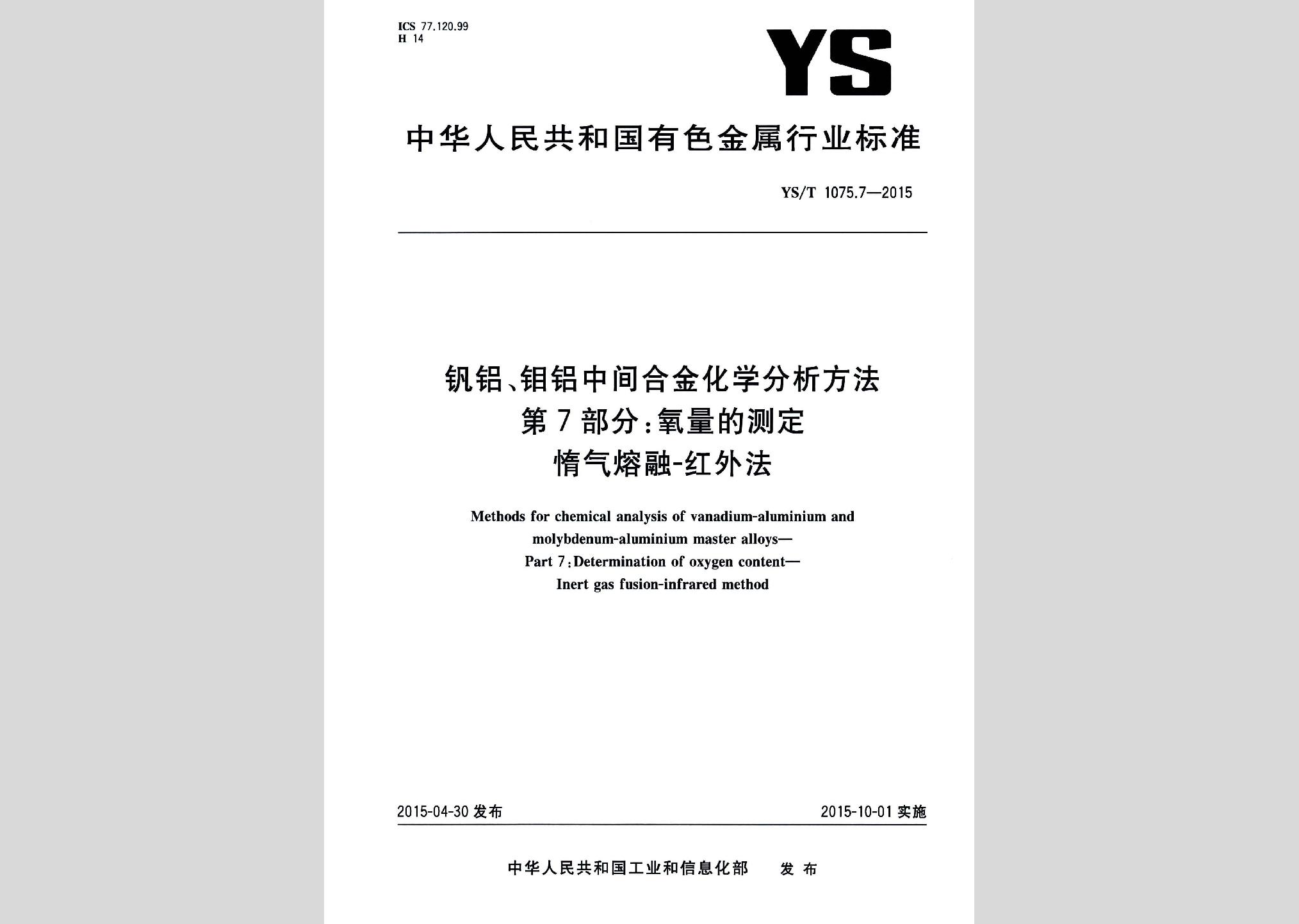 YS/T1075.7-2015:钒铝、钼铝中间合金化学分析方法第7部分:氧量的测定惰气熔融-红外法现行