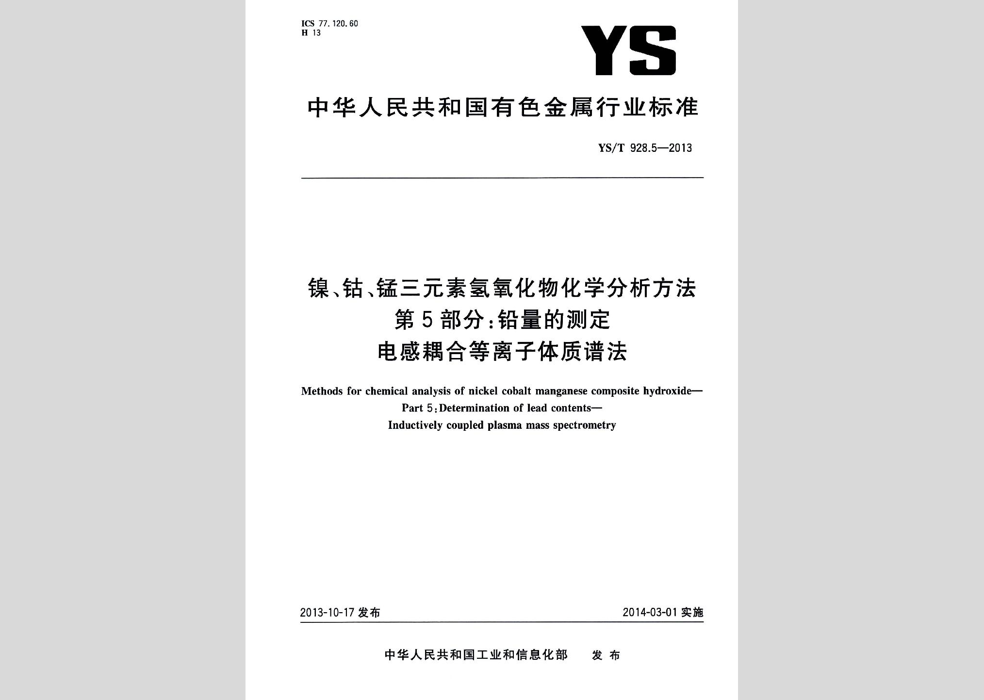 YS/T928.5-2013:镍、钴、锰三元素氢氧化物化学分析方法第5部分:铅量的测定电感耦合等离子体质谱法现行