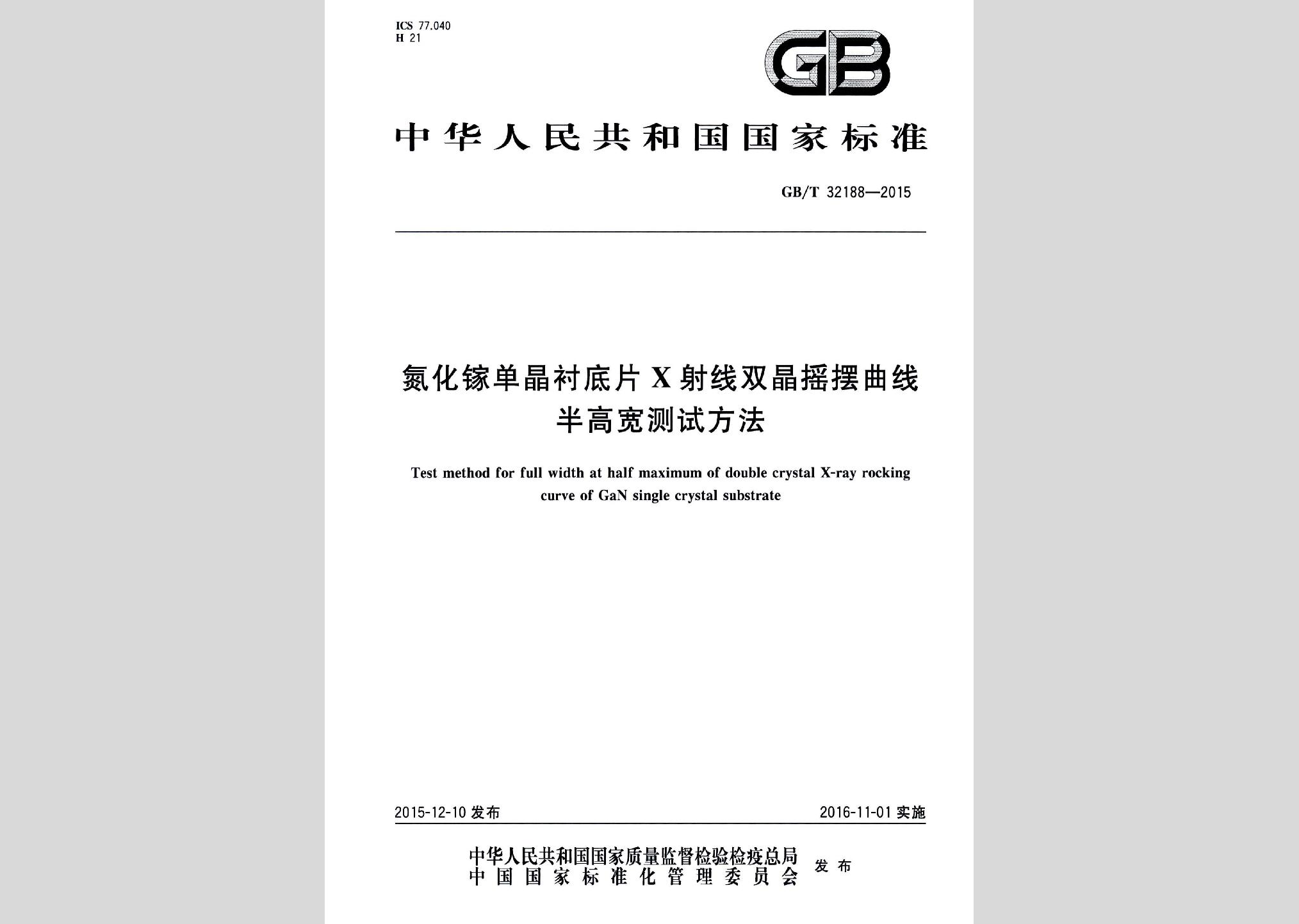 GB/T32188-2015:氮化镓单晶衬底片x射线双晶摇摆曲线半高宽测试方法现行