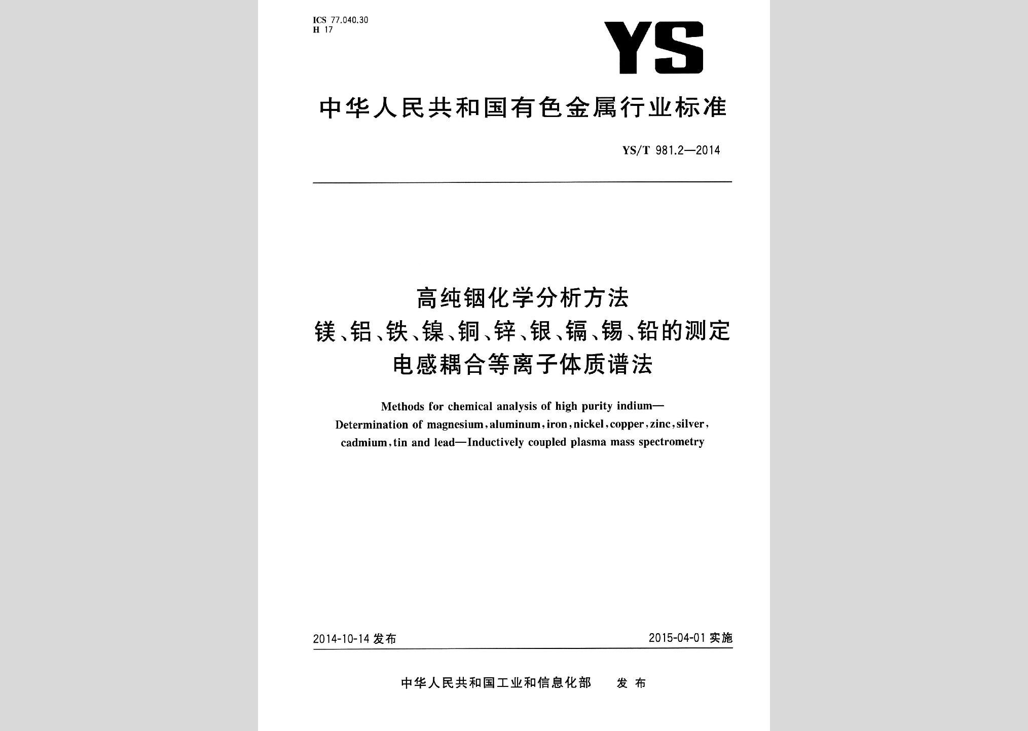 YS/T981.2-2014:高纯铟化学分析方法镁、铝、铁、镍、铜、锌、银、镉、锡、铅的测定电感耦合等离子体质谱法现行