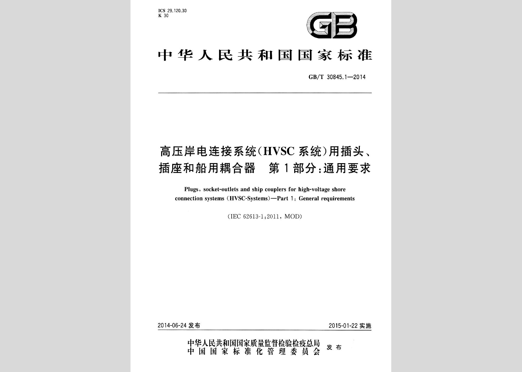 GB/T30845.1-2014:高压岸电连接系统(HVSC系统)用插头、插座和船用耦合器第1部分:通用要求现行