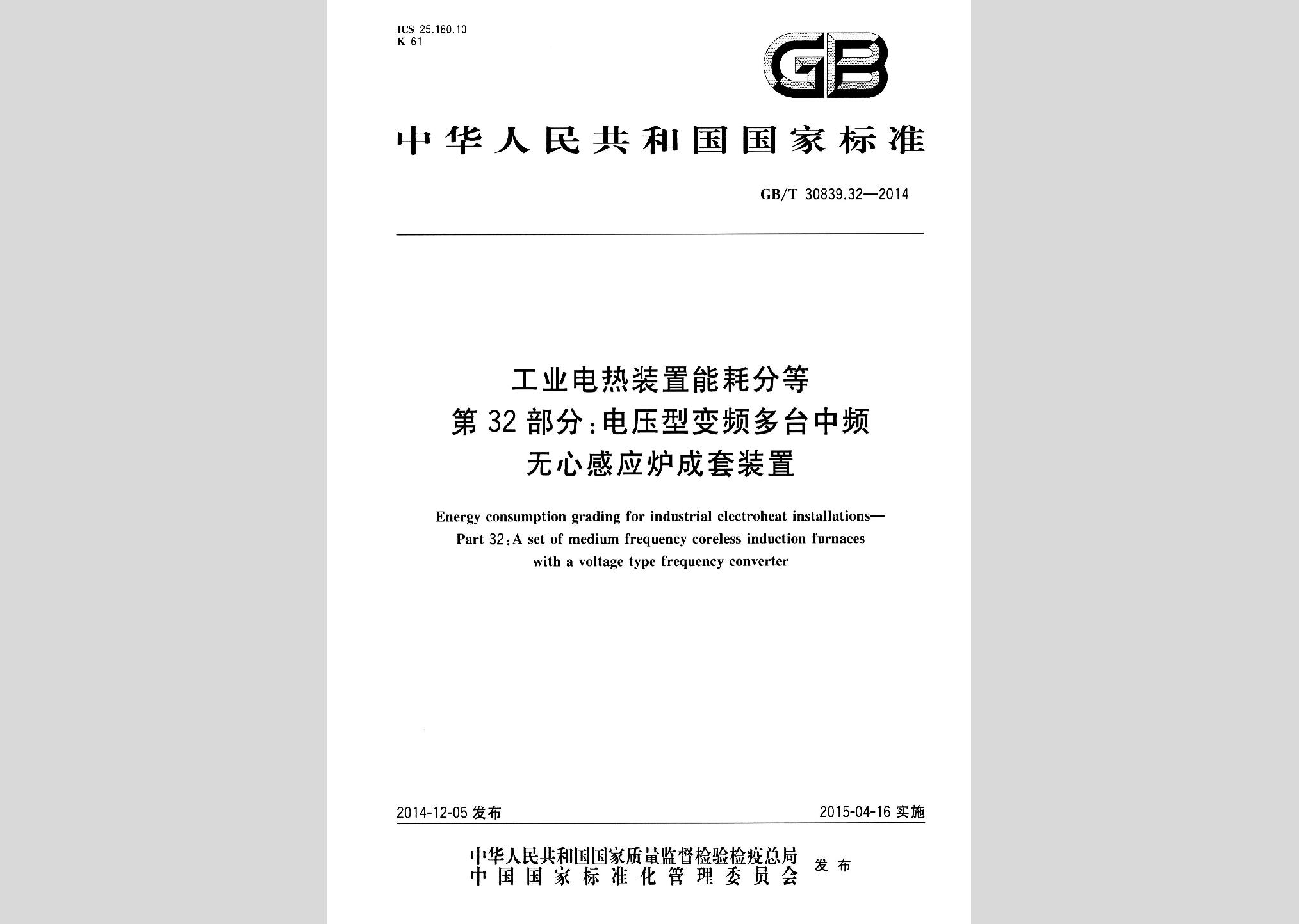 GB/T30839.32-2014:工业电热装置能耗分等第32部分:电压型变频多台中频无心感应炉成套装置现行
