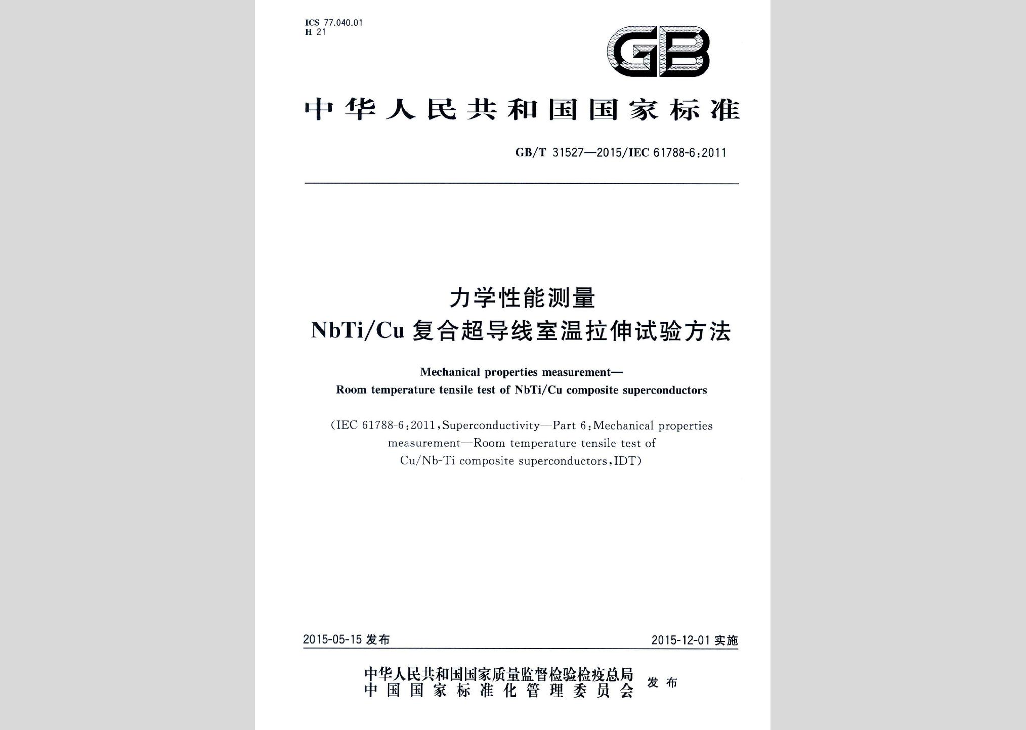 GB/T31527-2015:力学性能测量NbTi/Cu复合超导线室温拉伸试验方法现行