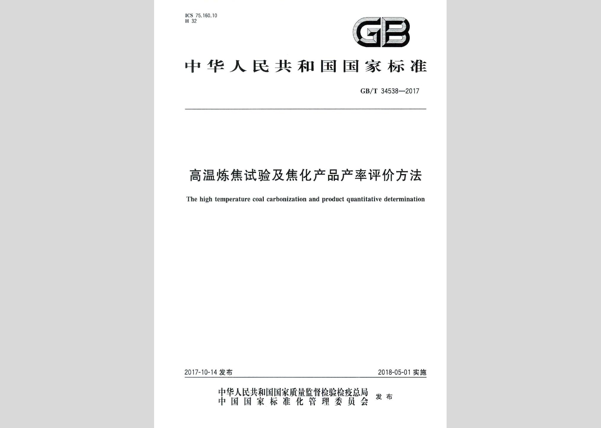 GB/T34538-2017:高温炼焦试验及焦化产品产率评价方法现行