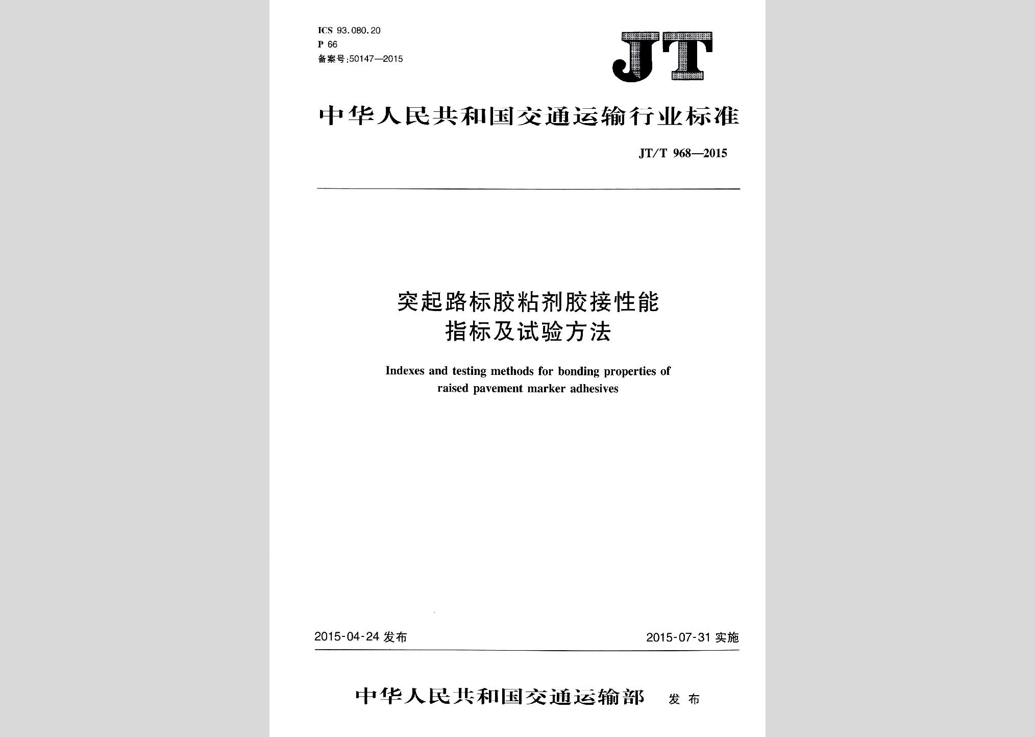 JT/T968-2015:突起路标胶粘剂胶接性能指标及试验方法现行