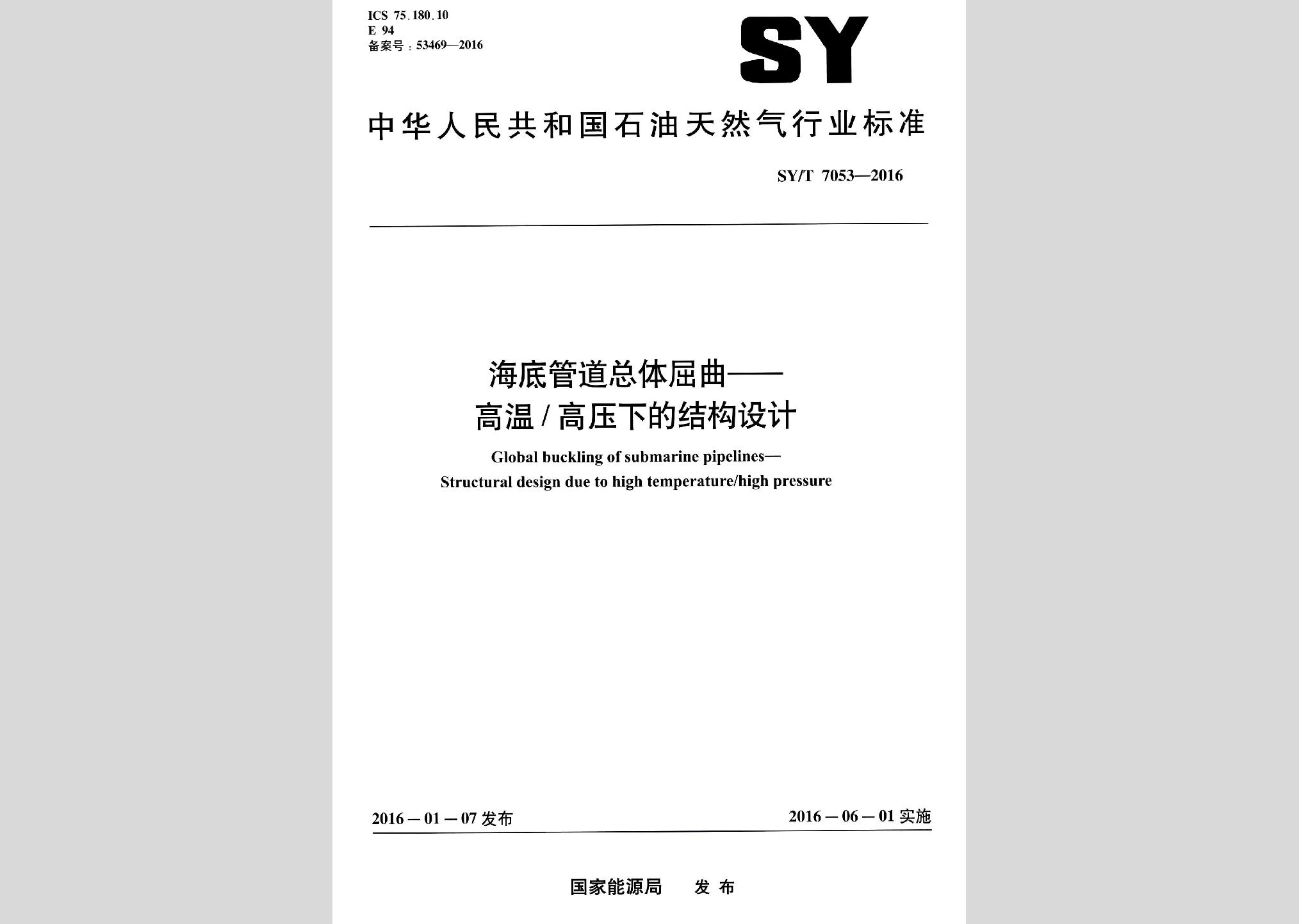 SY/T7053-2016:海底管道总体屈曲——高温/高压下的结构设计现行