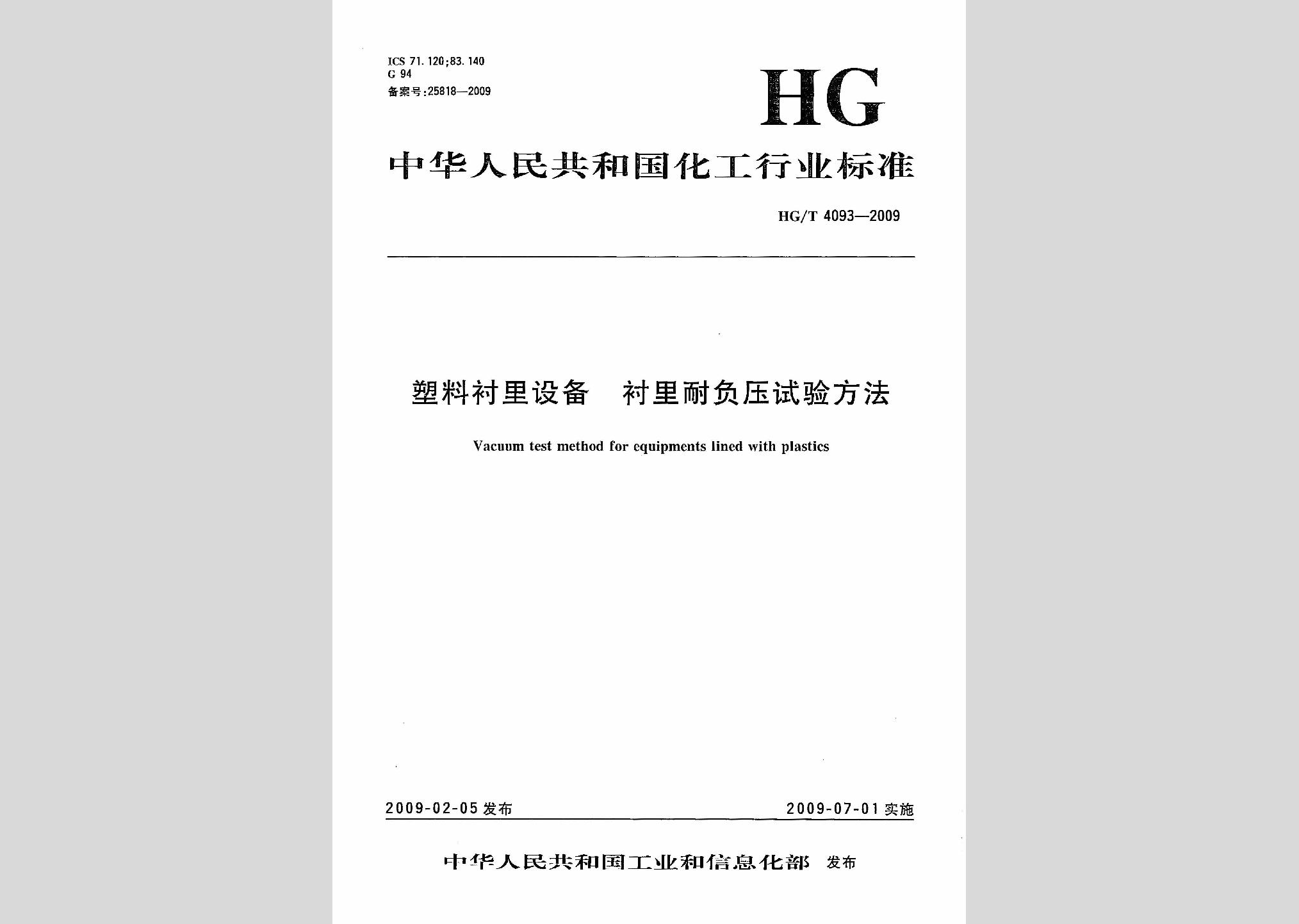HG/T4093-2009:塑料衬里设备衬里耐负压试验方法废止