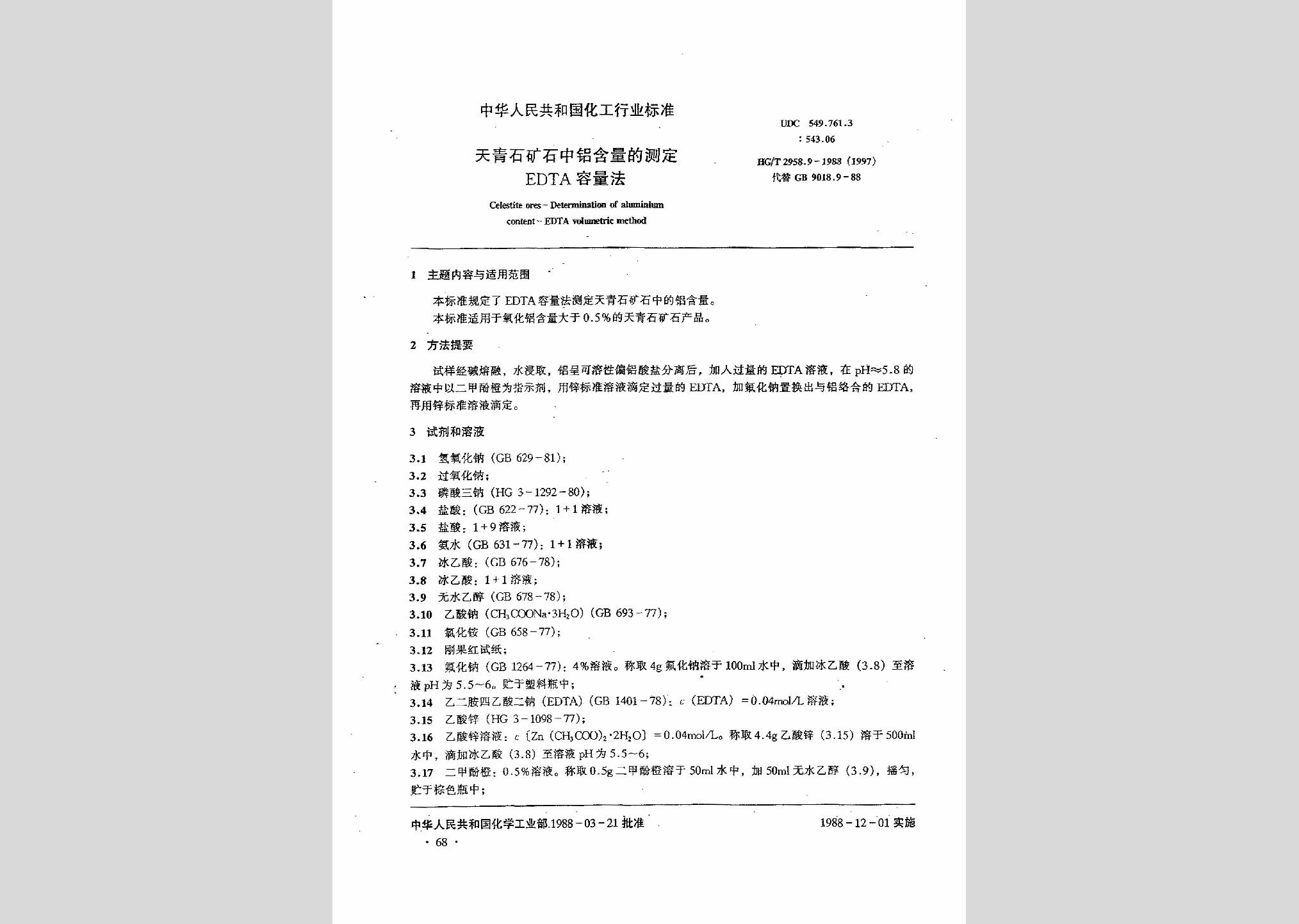 HG/T2958.9-1988(1997):天青石矿石中铝含量的测定EDTA容量法现行