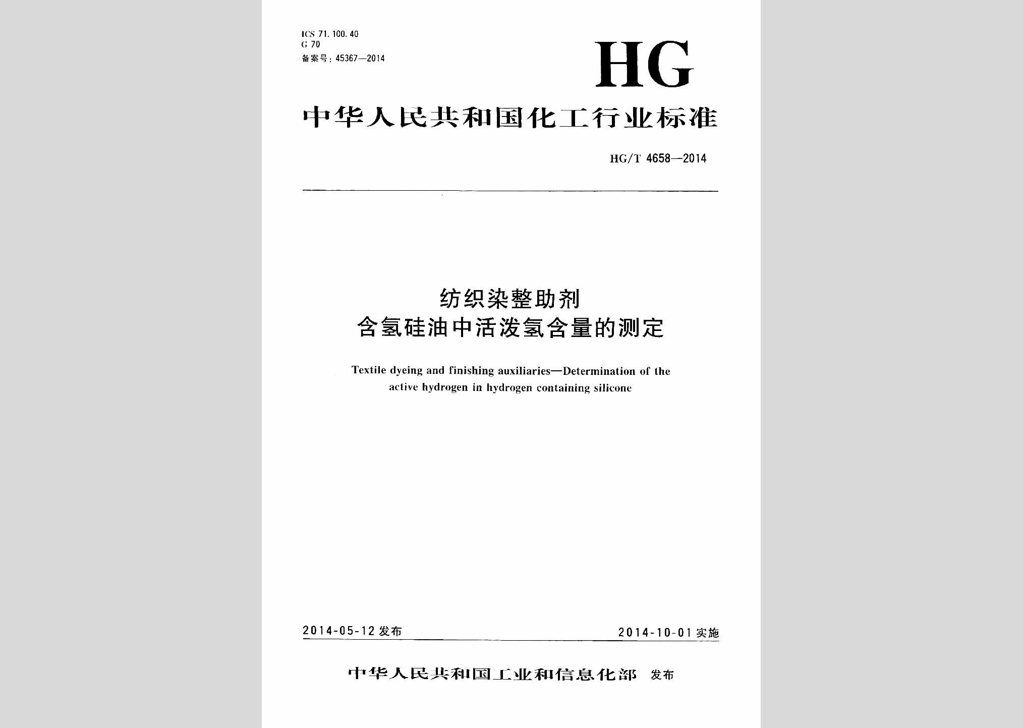 HG/T4658-2014:纺织染整助剂含氢硅油中活泼氢含量的测定现行