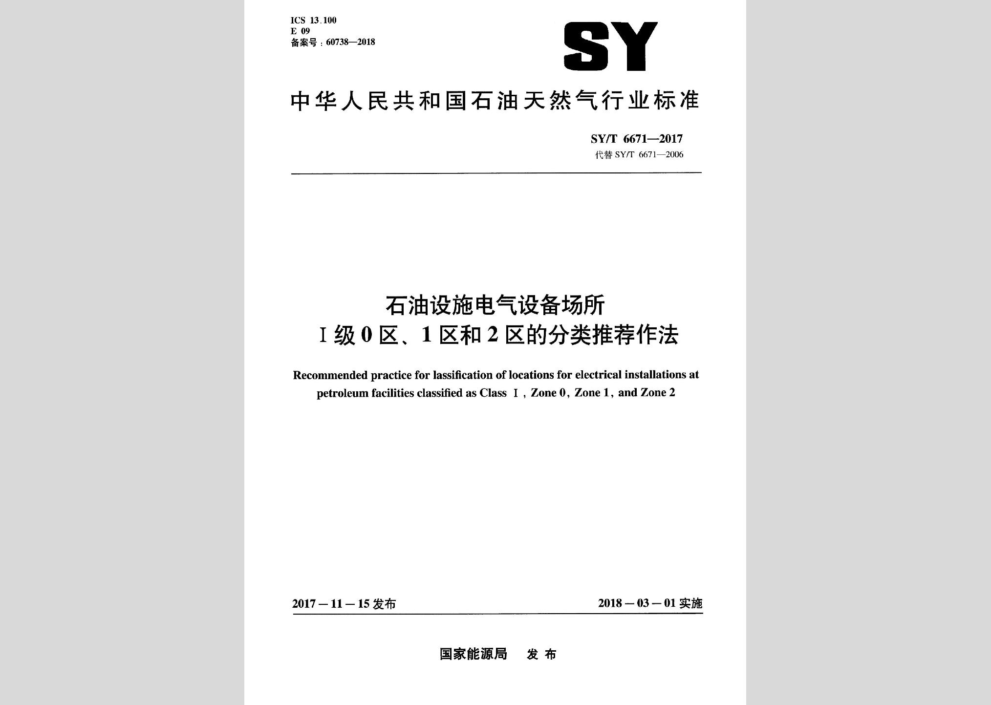 SY/T6671-2017:石油设施电气设备场所Ⅰ级0区、1区和2区的分类推荐作法现行