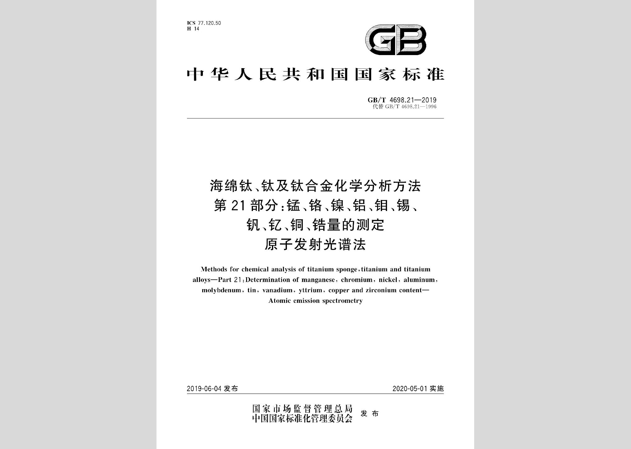 GB/T4698.21-2019:海绵钛、钛及钛合金化学分析方法第21部分:锰、铬、镍、铝、钼、锡、钒、钇、铜、锆量的测定原子发射光谱法现行