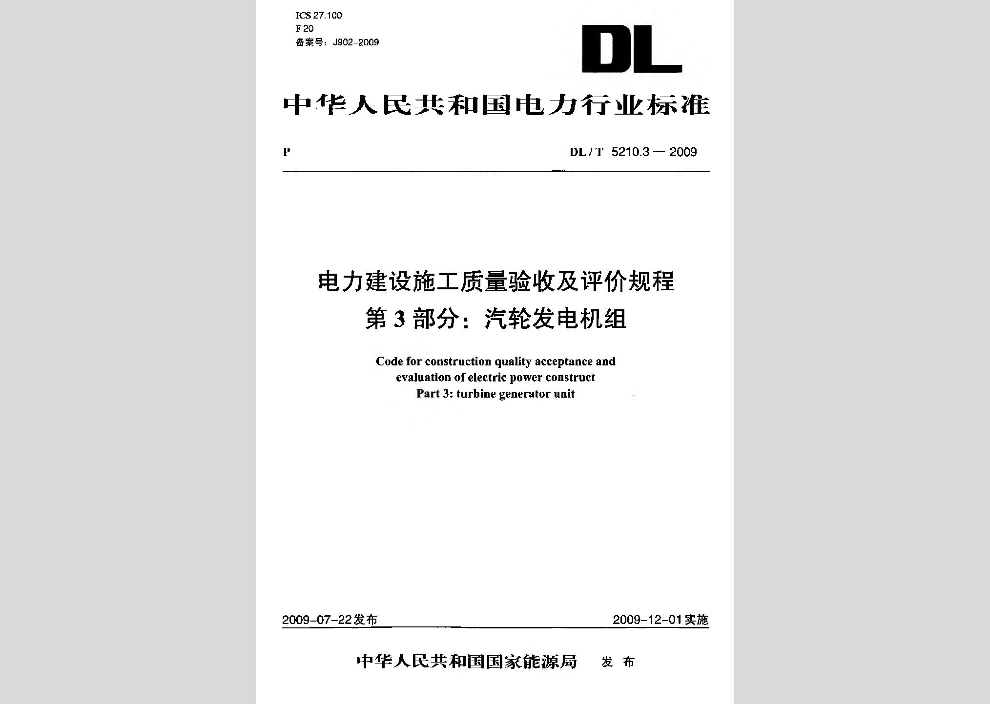 DL/T5210.3-2009:电力建设施工质量验收及评价规程第3部分:汽轮发电机组废止