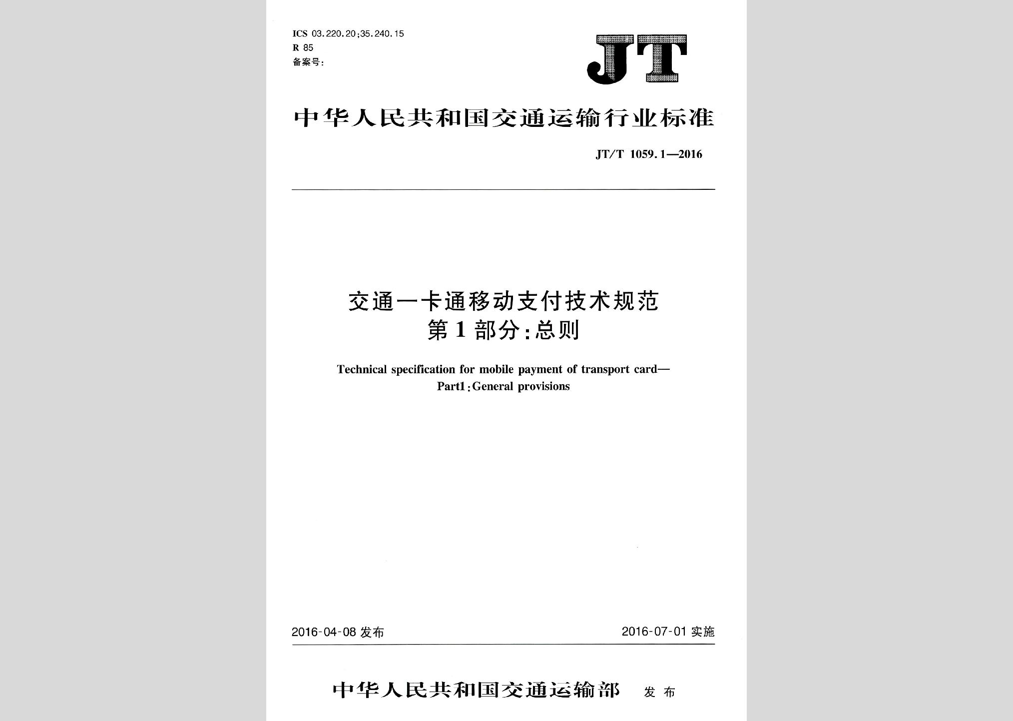JT/T1059.1-2016:交通一卡通移动支付技术规范第1部分:总则现行