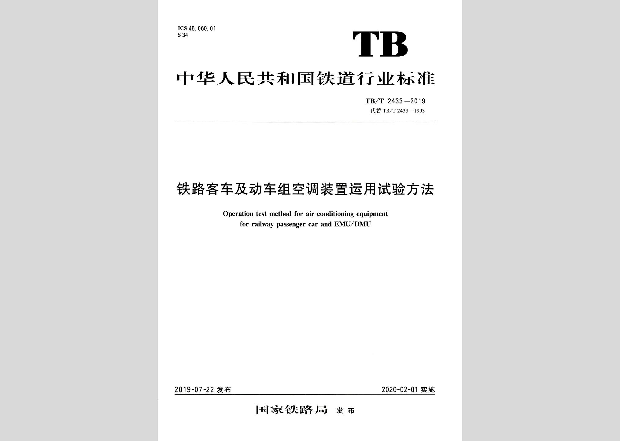 TB/T2433-2019:铁路客车及动车组空调装置运用试验方法现行