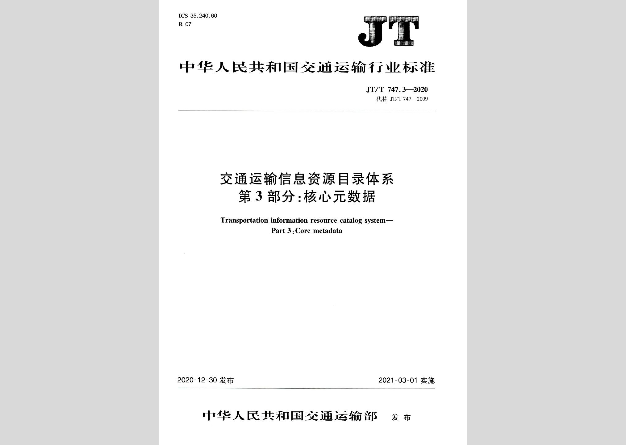 JT/T747.3-2020:交通运输信息资源目录体系第3部分:核心元数据现行