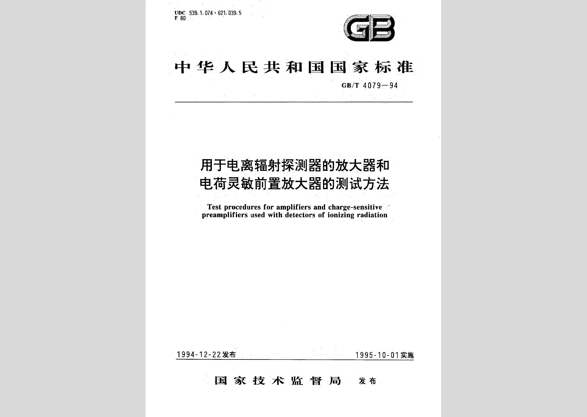 GB/T4079-1994:用于电离辐射探测器的放大器和电荷灵敏前置放大器的测试方法现行