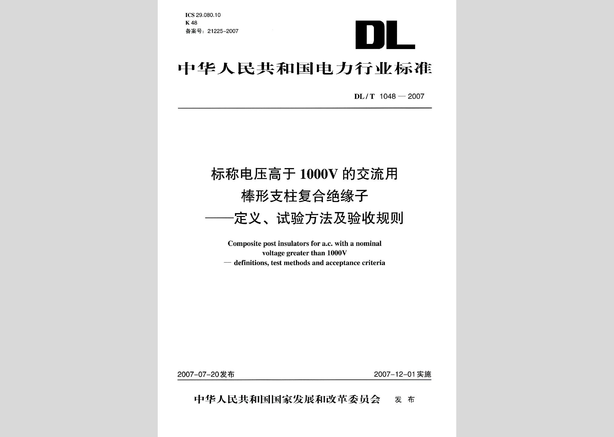 DL/T1048-2007:标称电压高于1000V的交流用棒形支柱复合绝缘子——定义、试验方法及验收规则废止
