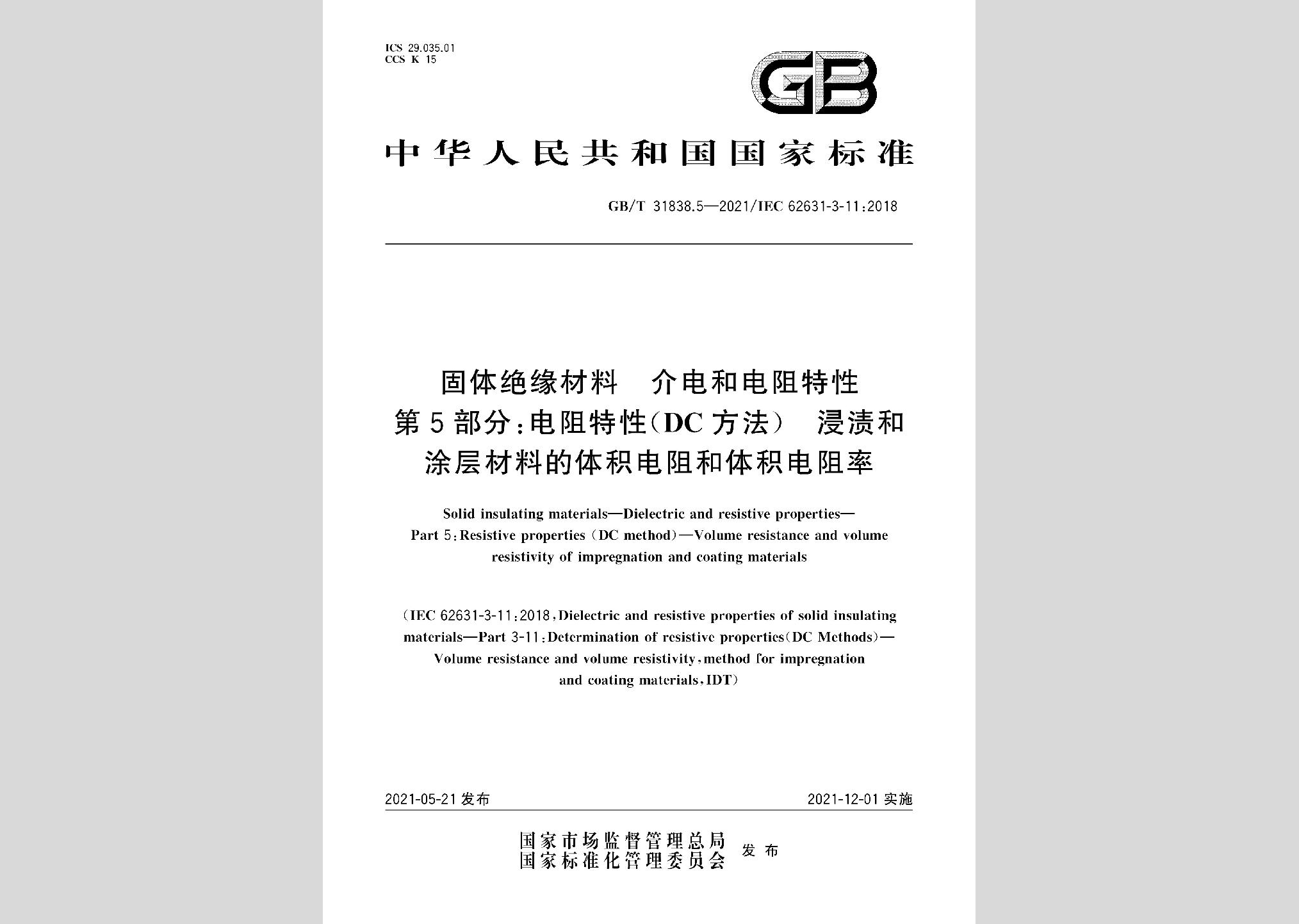 GB/T31838.5-2021:固体绝缘材料介电和电阻特性第5部分:电阻特性(DC方法)浸渍和涂层材料的体积电阻和体积电阻率现行