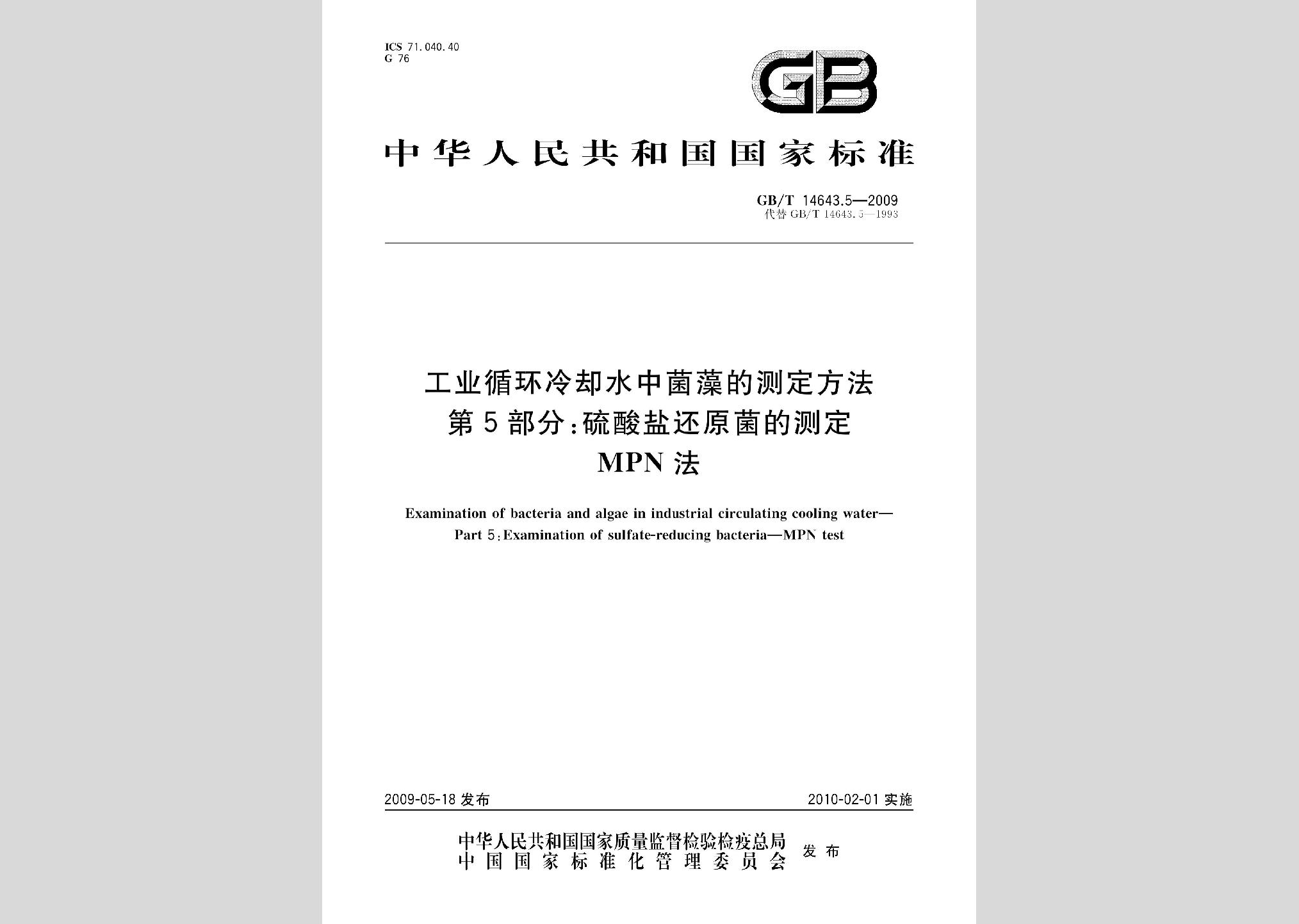 GB/T14643.5-2009:工业循环冷却水中菌藻的测定方法第5部分:硫酸盐还原菌的测定MPN法现行