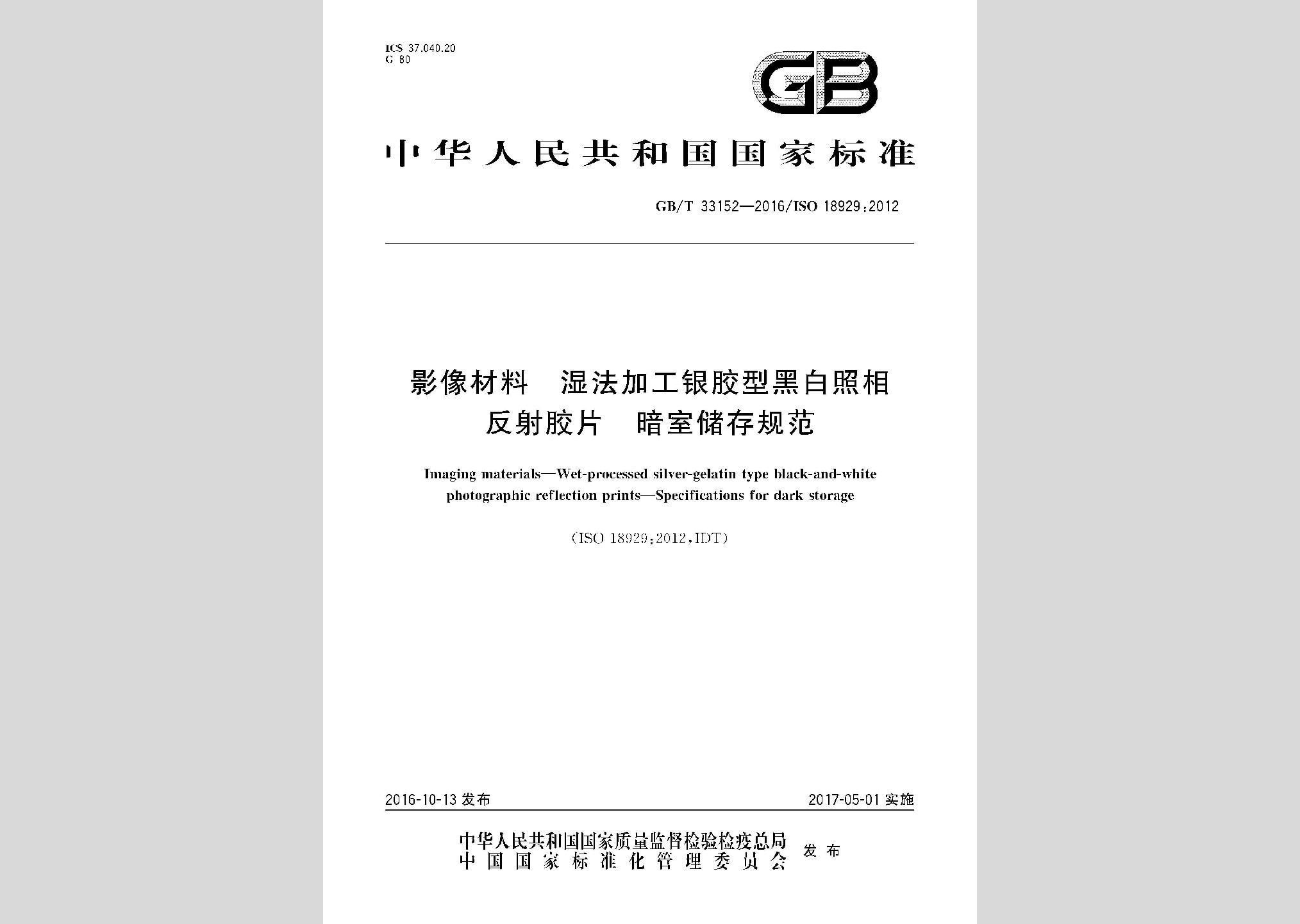 GB/T33152-2016:影像材料湿法加工银胶型黑白照相反射胶片暗室储存规范现行