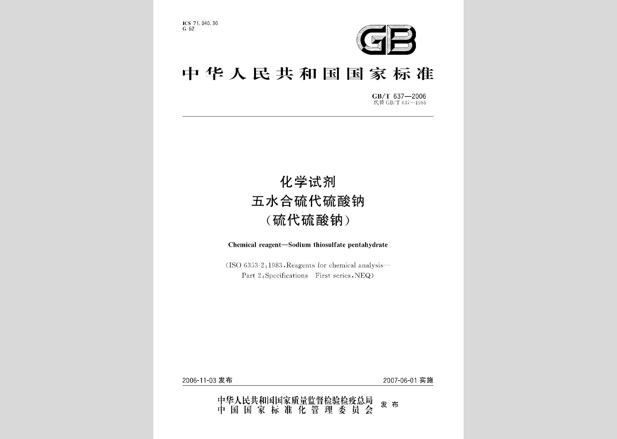 GB/T637-2006:化学试剂五水合硫代硫酸钠(硫代硫酸钠)现行