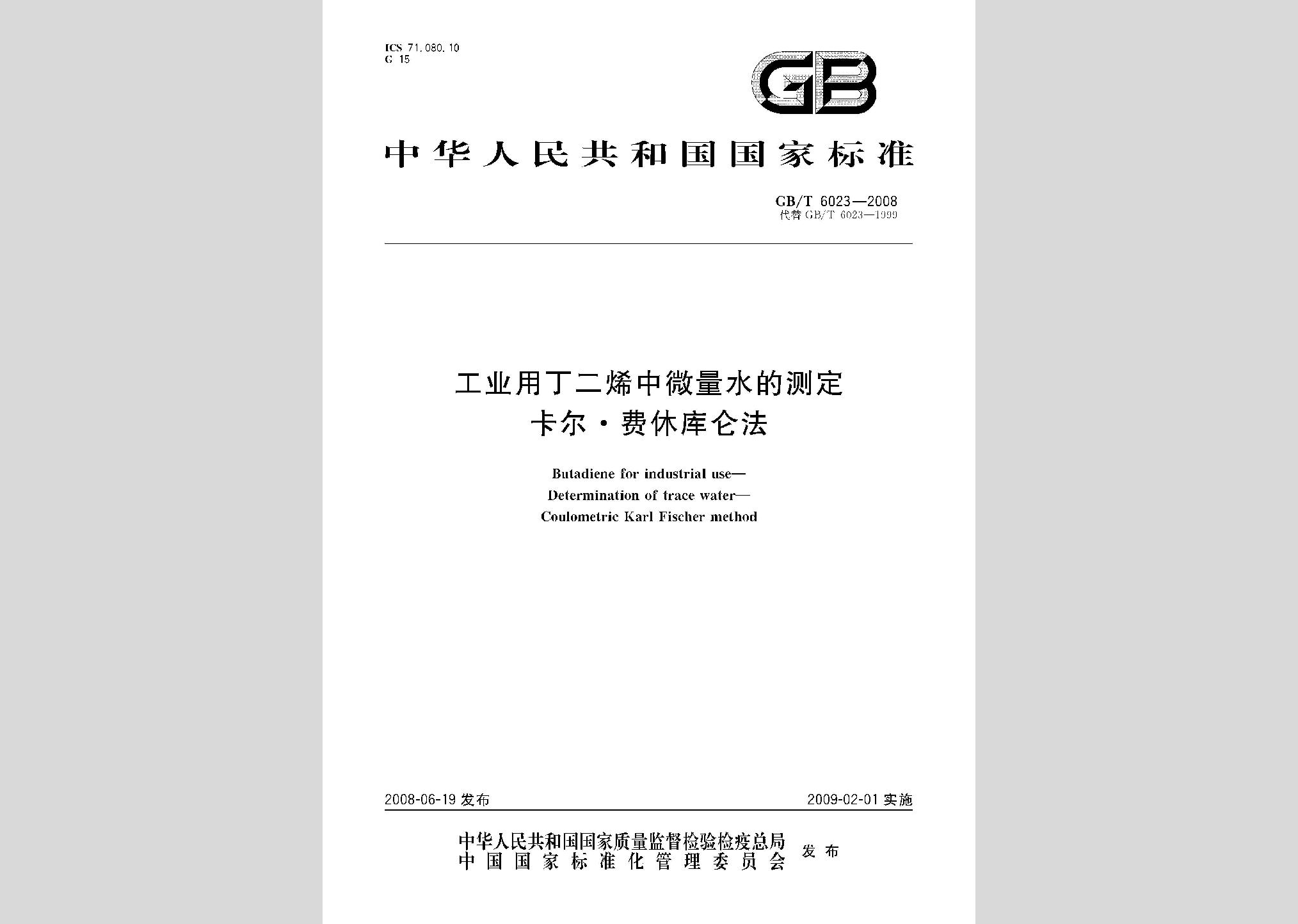 GB/T6023-2008:工业用丁二烯中微量水的测定卡尔·费休库仑法现行
