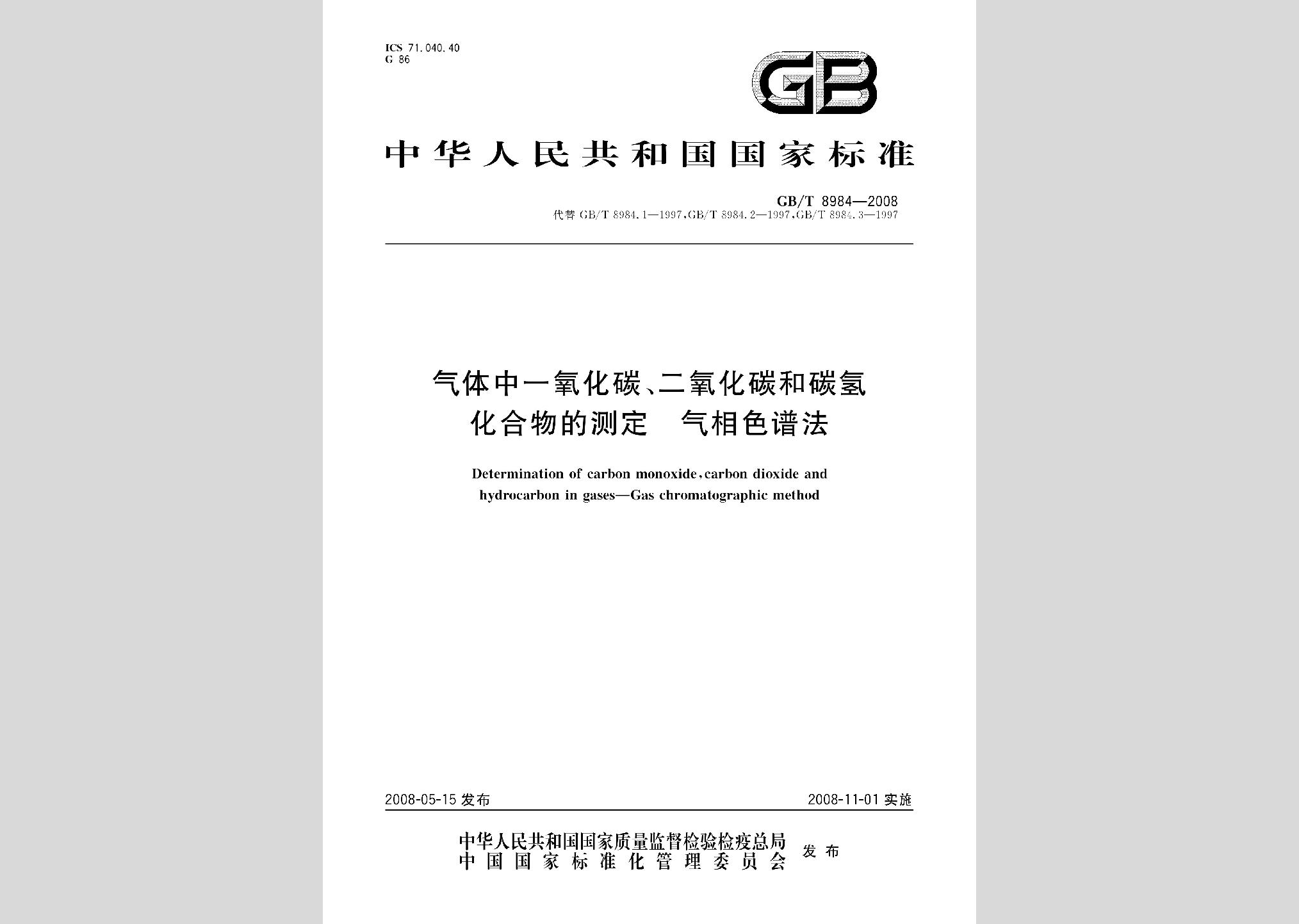 GB/T8984-2008:气体中一氧化碳、二氧化碳和碳氢化合物的测定气相色谱法现行