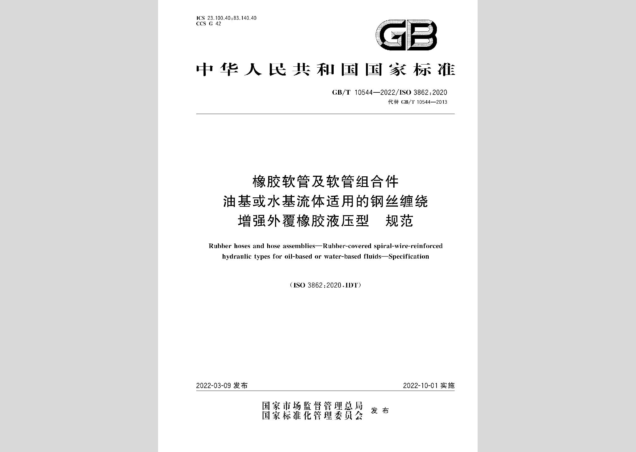 GB/T10544-2022:橡胶软管及软管组合件油基或水基流体适用的钢丝缠绕增强外覆橡胶液压型规范现行