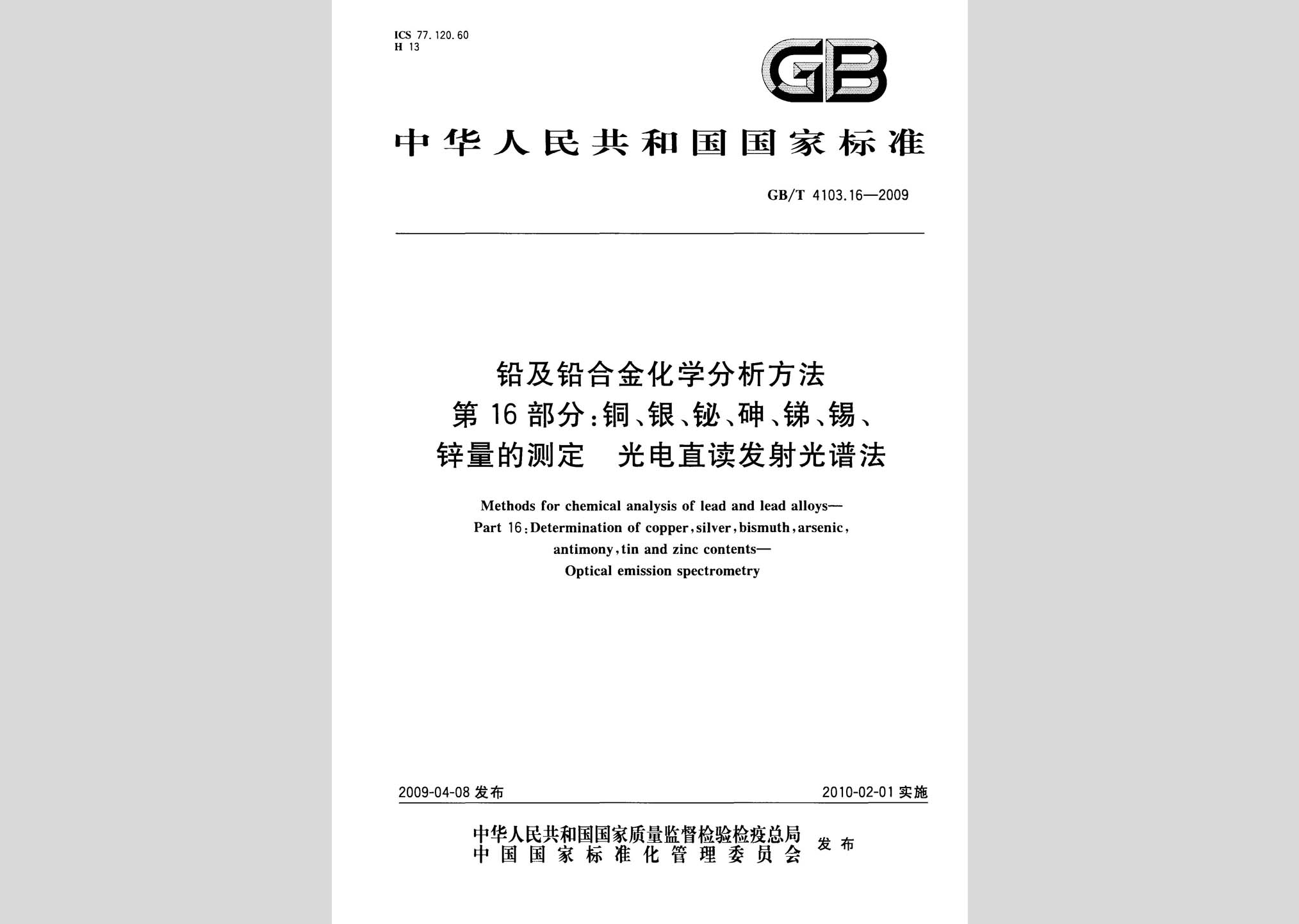 GB/T4103.16-2009:铅及铅合金化学分析方法第16部分:铜、银、铋、砷、锑、锡、锌量的测定光电直读发射光谱法现行