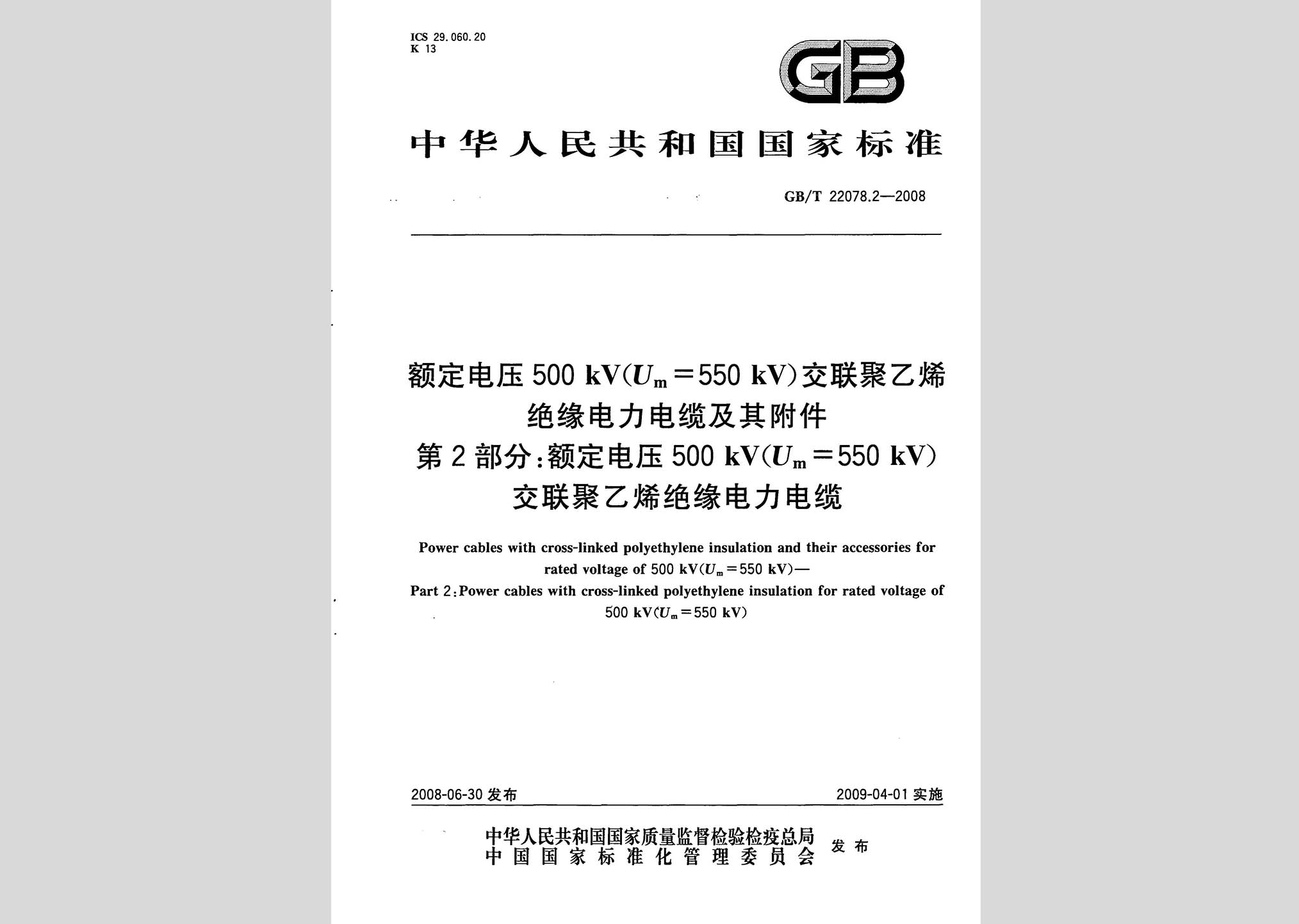 GB/T22078.2-2008:额定电压500kV(Um=550kV)交联聚乙烯绝缘电力电缆及其附件第2部分:额定电压500kV(Um=550kV)交联聚乙烯绝缘电力电缆现行