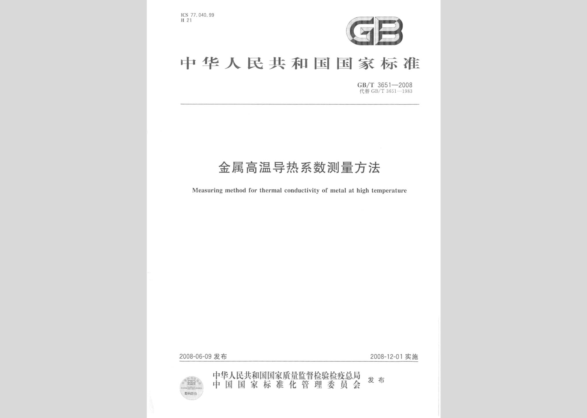 GB/T3651-2008:金属高温导热系数测量方法现行