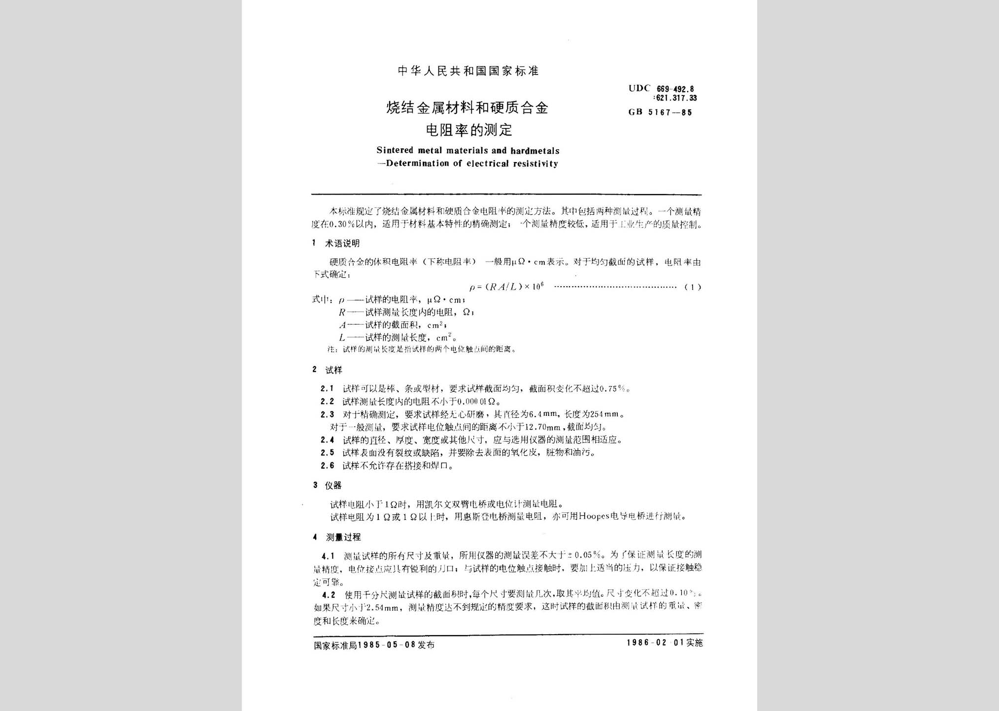 GB/T 5167-1985:烧结金属材料和硬质合金电阻率的测定废止