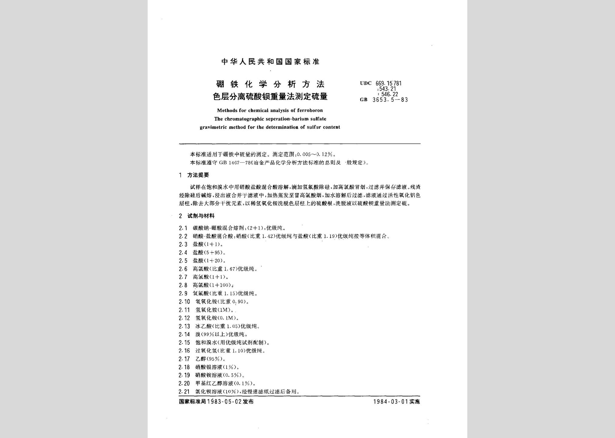 GB/T 3653.5-1983:硼铁化学分析方法色层分离硫酸钡重量法测定硫量现行