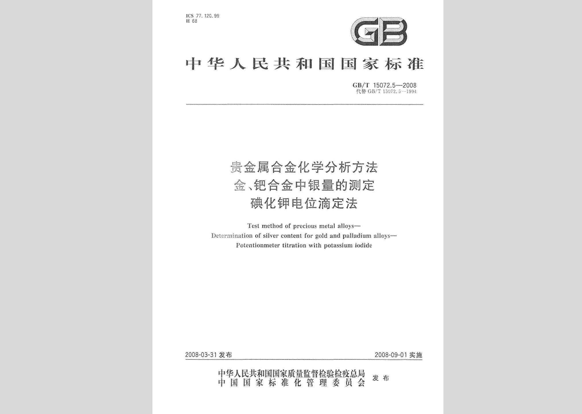 GB/T 15072.5-2008:贵金属合金化学分析方法金、钯合金中银量的测定碘化钾电位滴定法现行