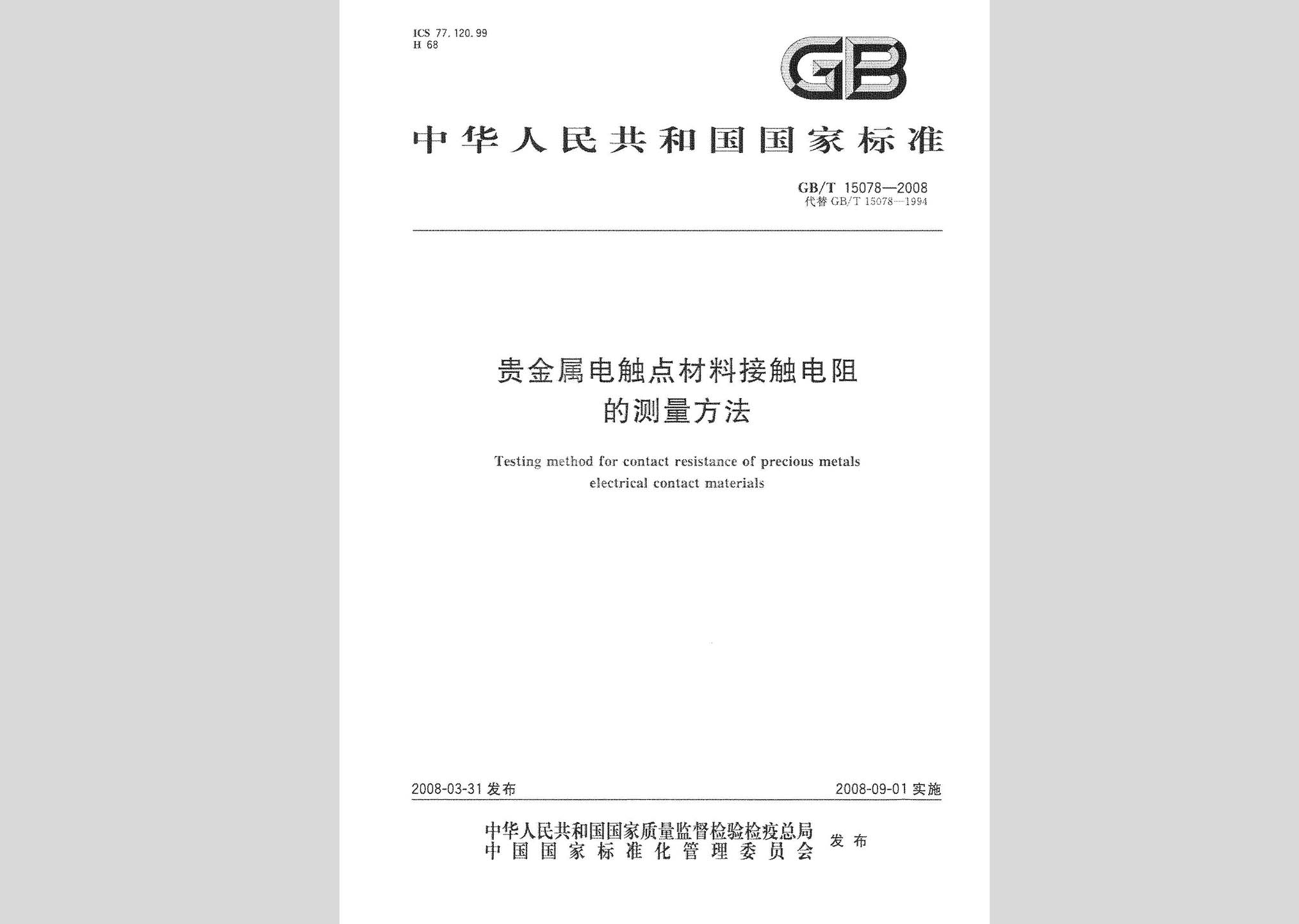 GB/T 15078-2008:贵金属电触点材料接触电阻的测量方法废止