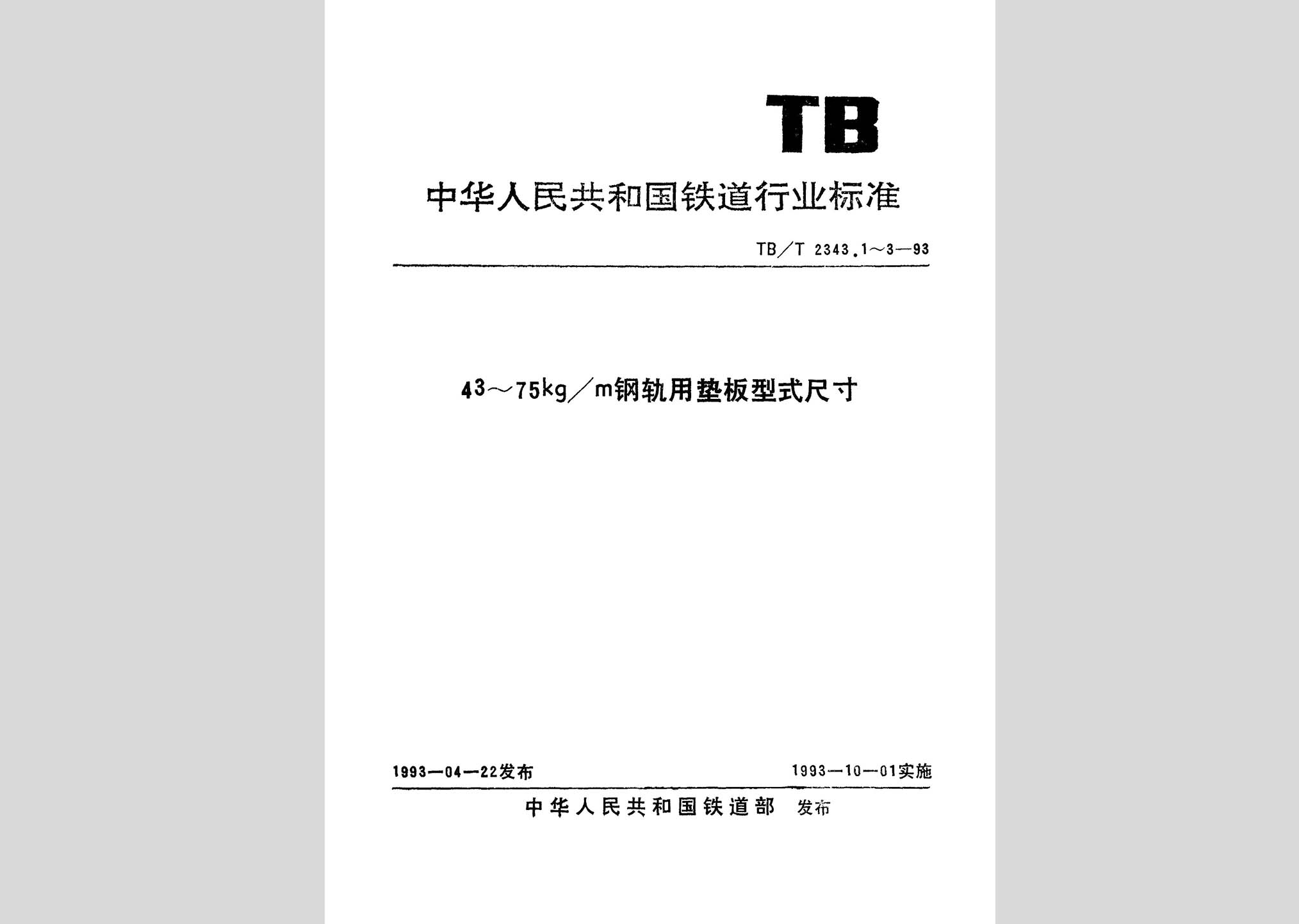 TB/T 2343.3-1993:60kg/m钢轨及75kg/m钢轨用垫板型式尺寸现行