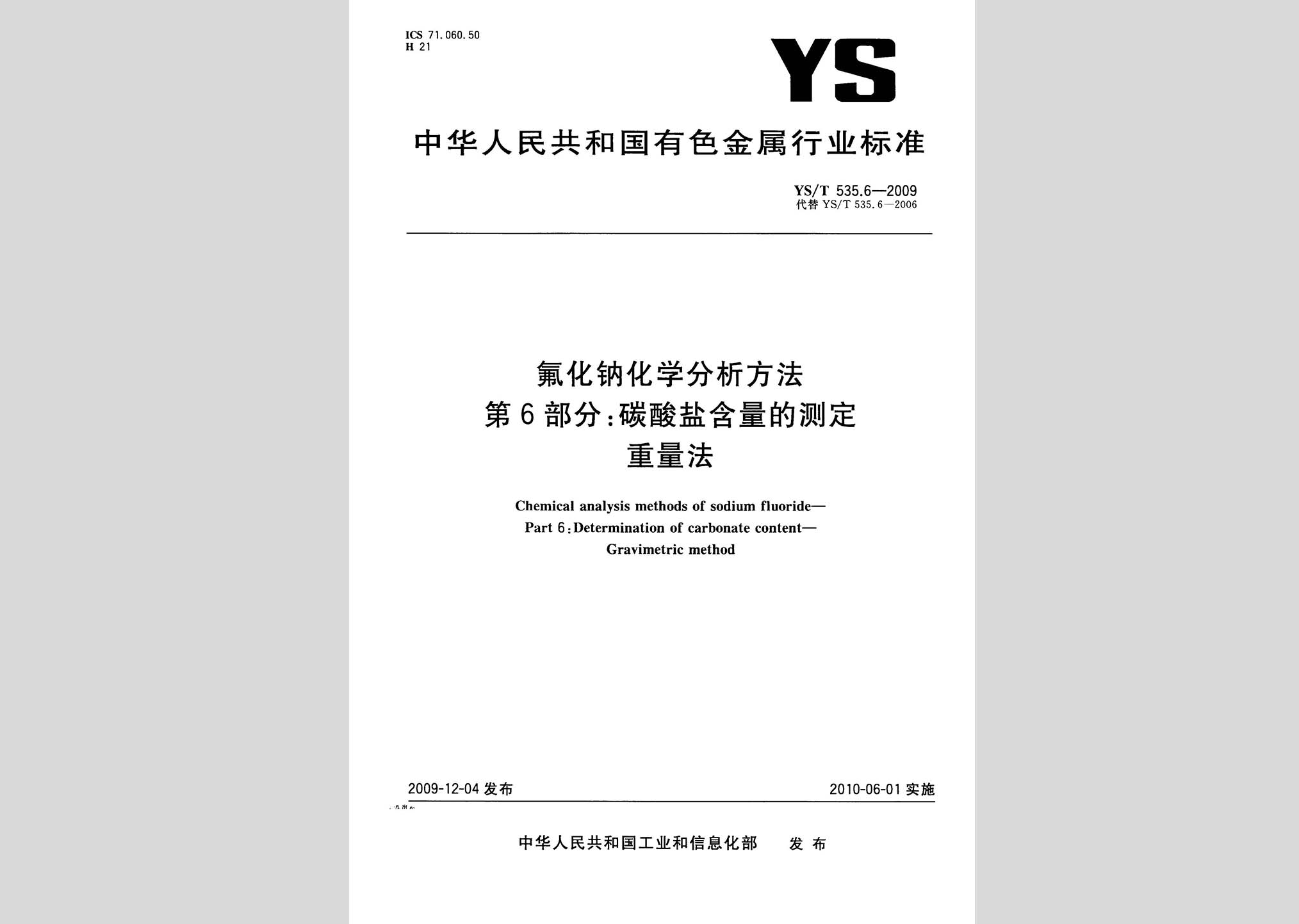 YS/T535.6-2009:氟化钠化学分析方法第6部分碳酸盐含量的测定重量法现行
