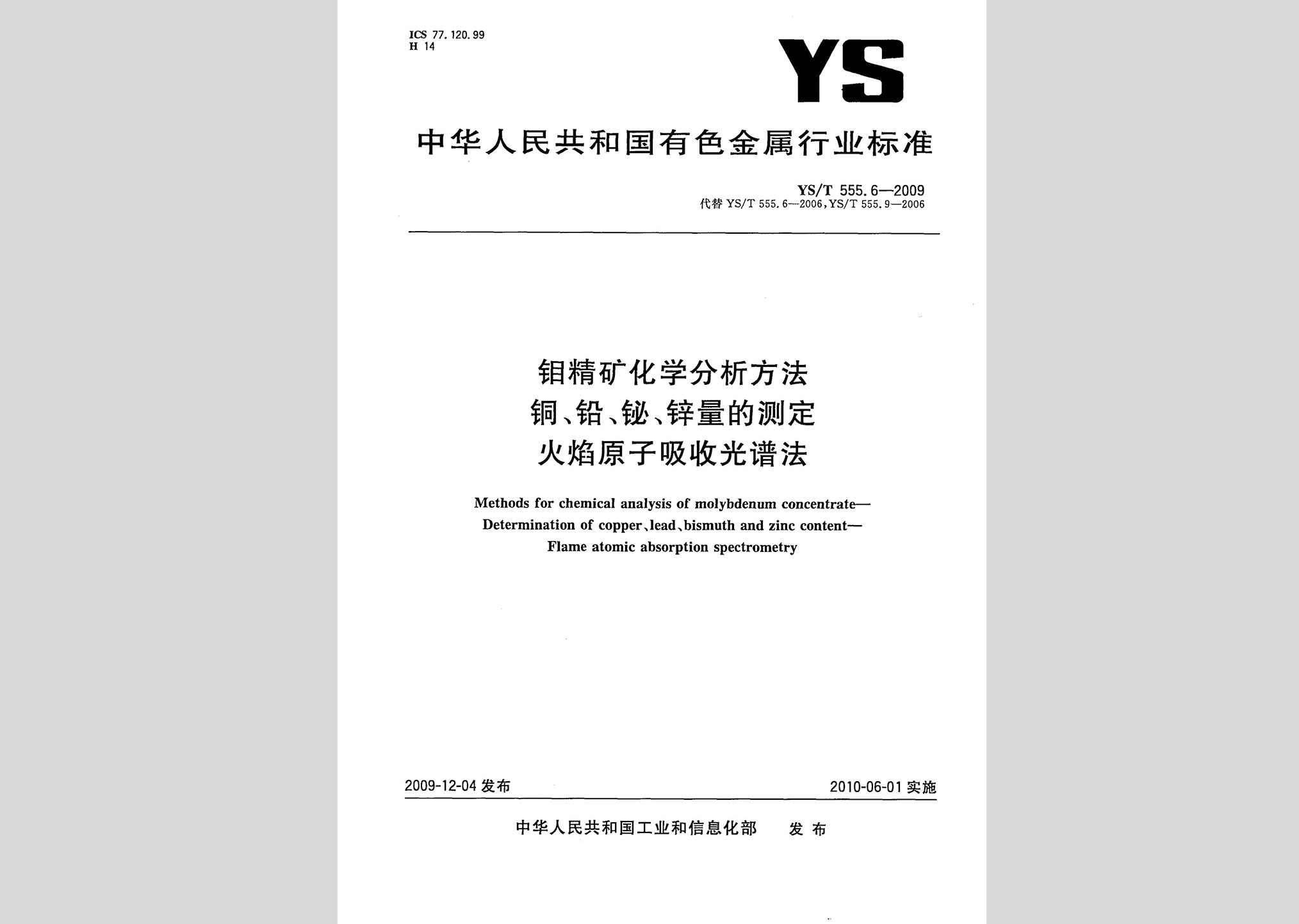 YS/T555.6-2009:钼精矿化学分析方法铜、铅、铋、锌量的测定火焰原子吸收光谱法现行