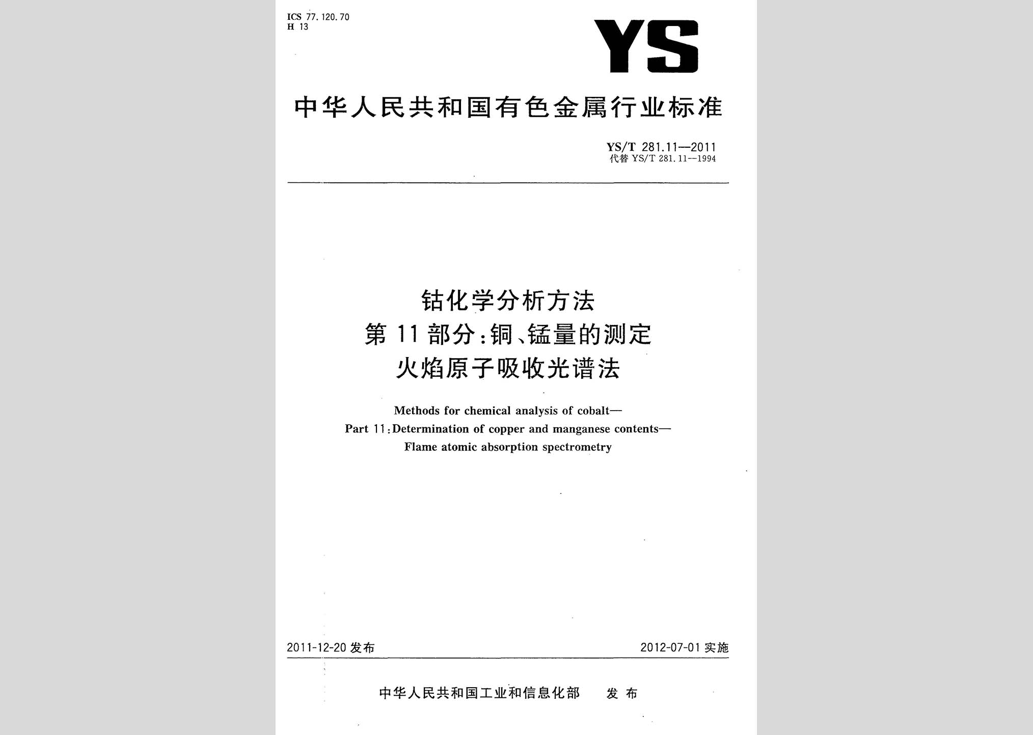 YS/T 281.11-2011:钴化学分析方法第11部分:铜、锰量的测定火焰原子吸收光谱法现行
