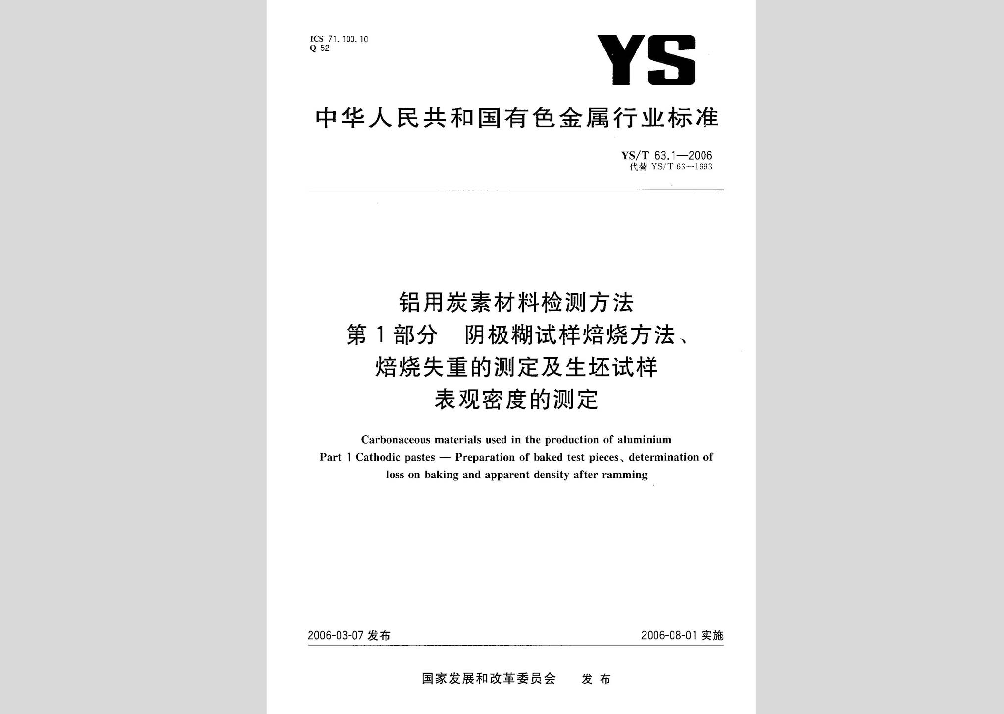 YS/T 63.1-2006:铝用炭素材料检测方法第1部分阴极糊试样蜡烧方法、熔烧失重的测定及生坯试样表观密度的测定废止