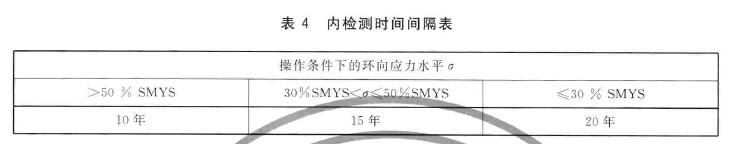 8.1.5 内检测时间间隔需要根据风险评价和上次完整性评价结果综合确定,最大评价时间间隔应符合表4要求。