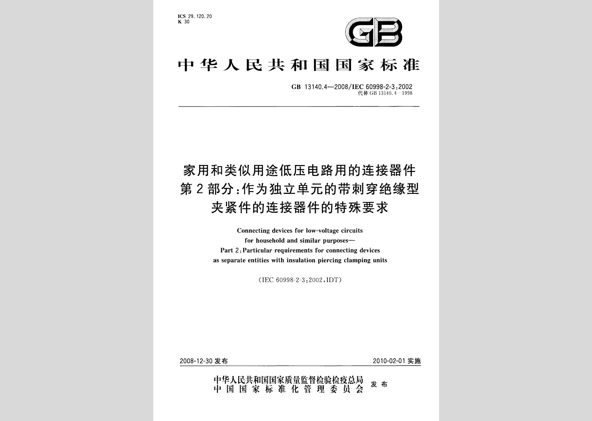 GB 13140.4-2008:家用和类似用途低压电路用的连接器件第2部分:作为独立单元的带刺穿绝缘型夹紧件的连接器件的特殊要求现行