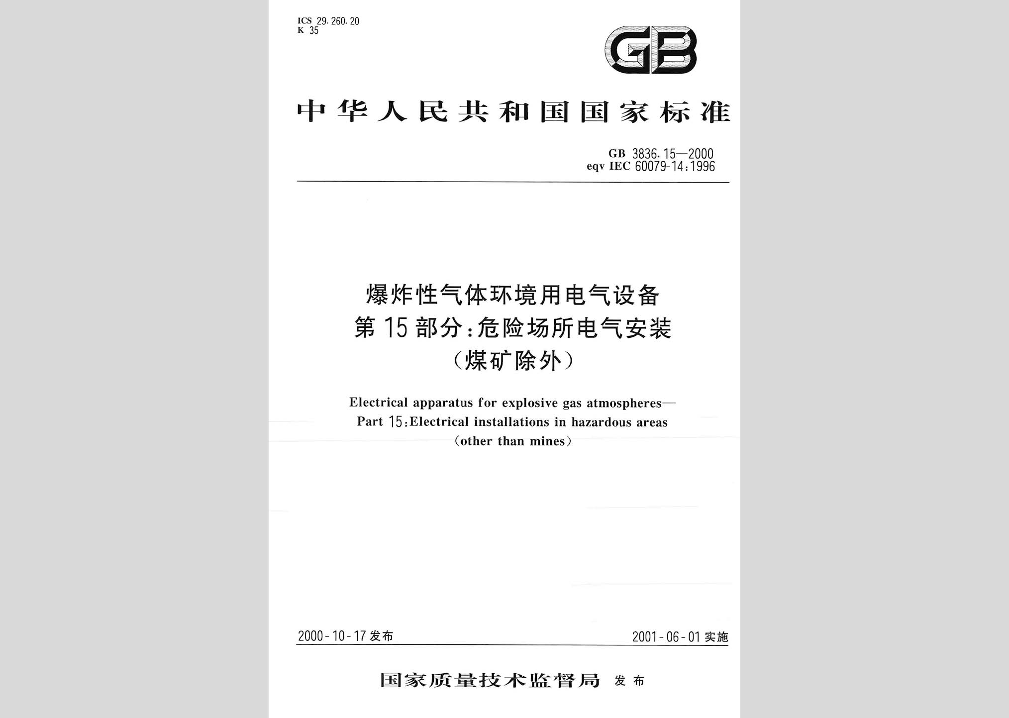 GB3836.15-2000:爆炸性气体环境用电气设备 第15部分:危险场所电气安装(煤矿除外)废止
