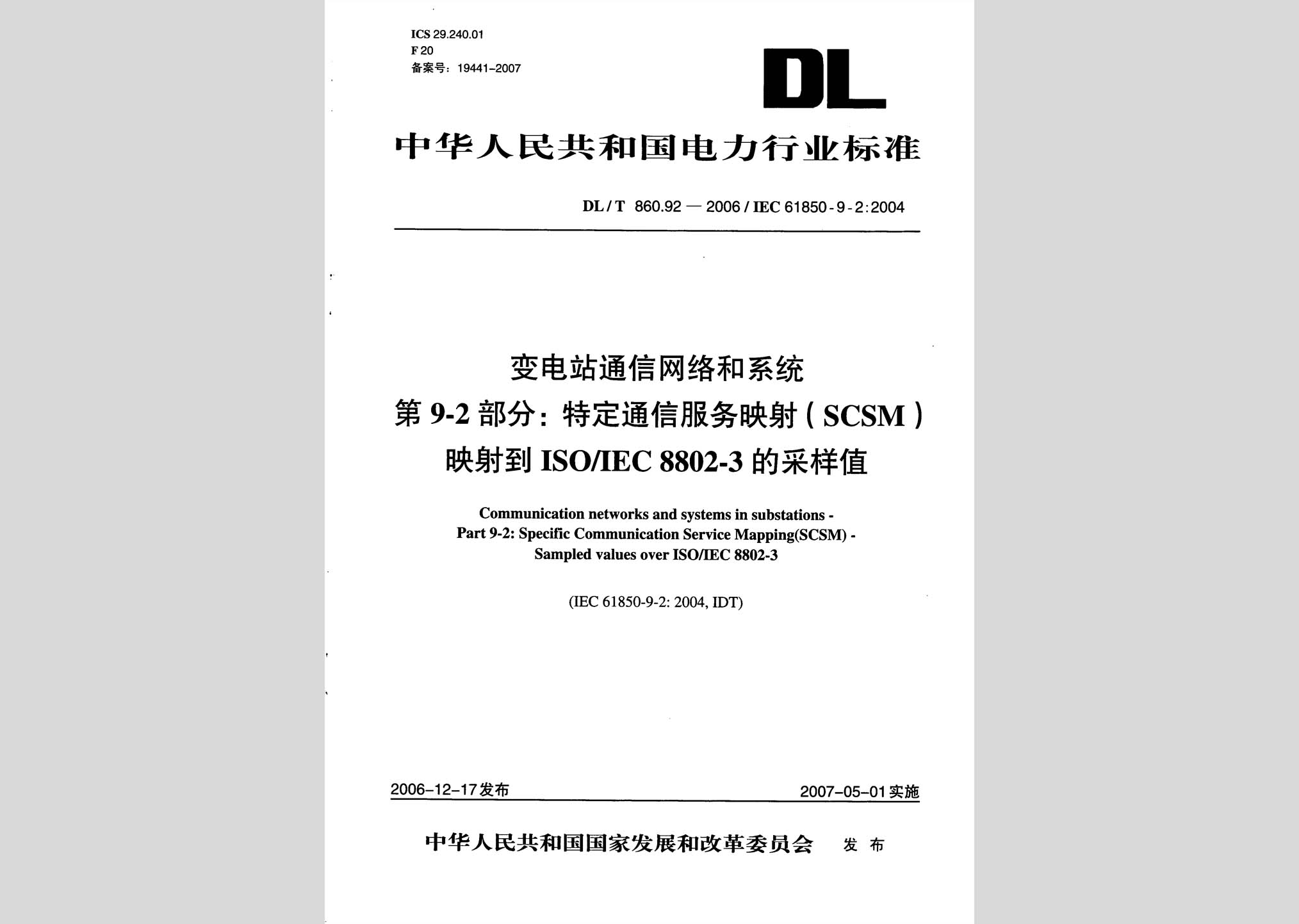 DL/T860.92-2006:变电站通信网络和系统第9-2部分:特定通信服务映射(SCSM)映射到ISOIIEC8802-3的采样值废止