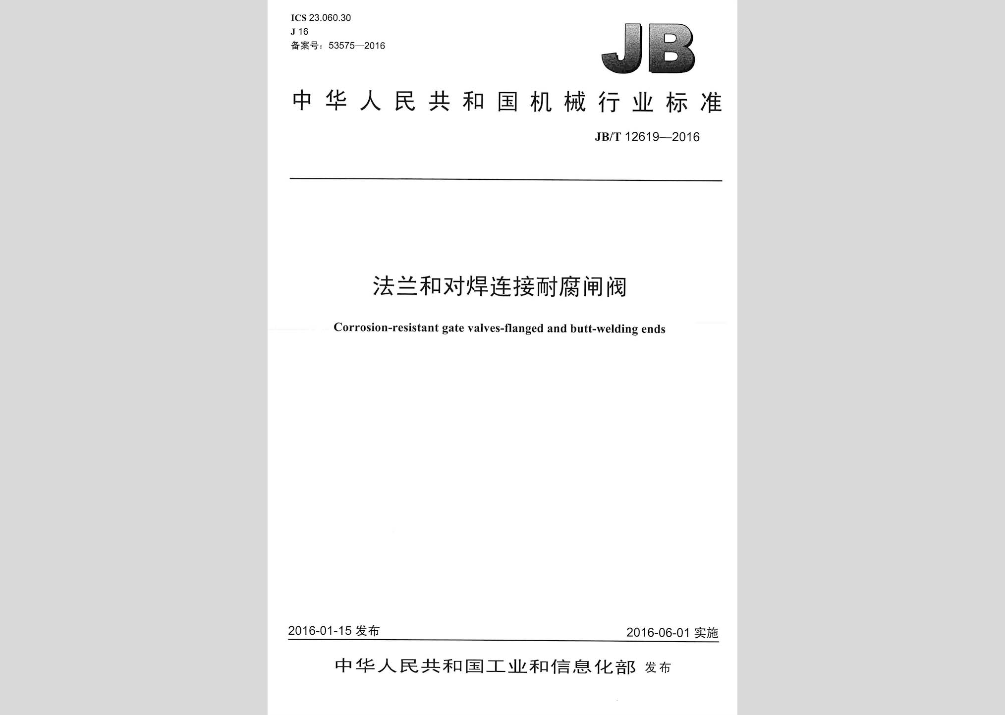 JB/T12619-2016:法兰和对焊连接耐腐闸阀现行