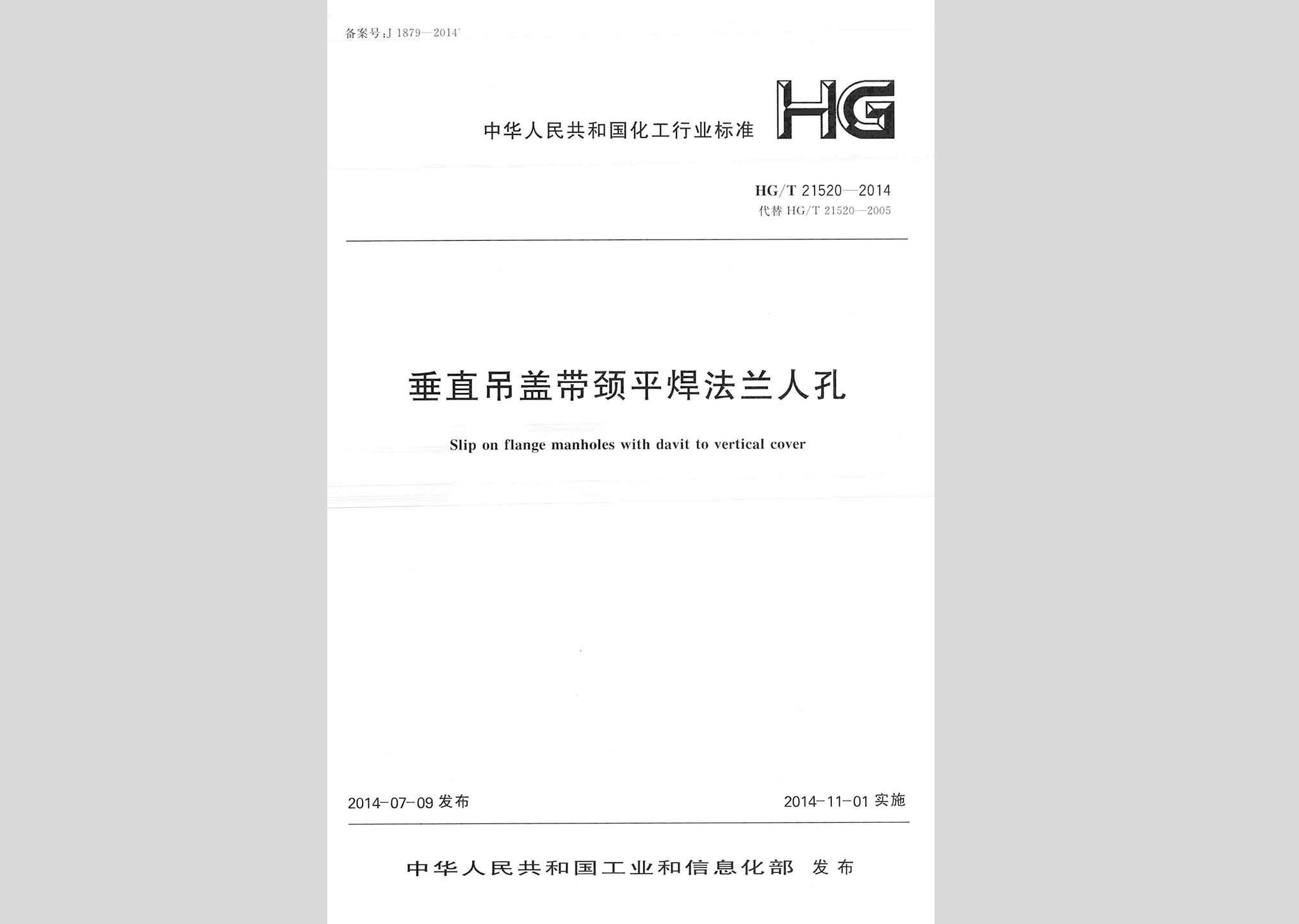 HG/T21520-2014:垂直吊盖带颈平焊法兰人孔现行