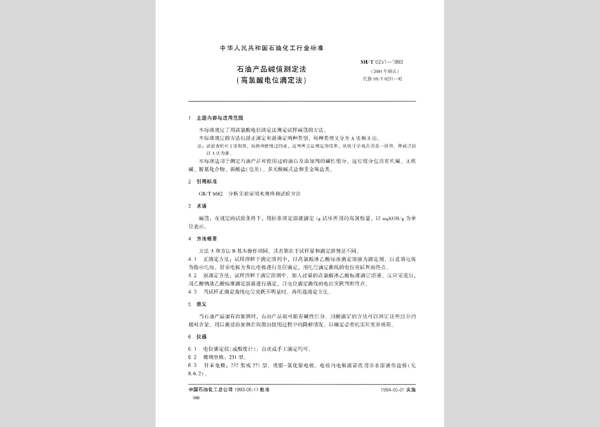 SH/T0251-1993(2004):石油产品碱值测定法(高氯酸电位滴定法)现行